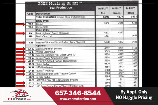 *We Work By Appointment Only* Call us at 714-202-2809 , Or email us at Sales@zeemotorsinc.com to schedule an appointment. *We Have The 'Best Cars at great prices'. At Zee-Motors we keep your car buying experience Simple and Easy.---- A rare Ford Mustang Bullitt Coupe #2099 of 4,377 Bullitt Green Mustang's----All Original---- * 2-OWNER* Clean Title. * Clean Carfax. * No Accidents.* Very Well Maintained Vehicle, Service records available on CARFAX. * Very Clean Inside and Outside.* Passed Safety inspection and Smog Check.Attention to all buyers: All special prices are cash price plus sales tax, license and registration fee, documentation fee, smog fee. Additional financing charges may apply on approved credit. While great effort is made to ensure the accuracy of the information provided on this site, errors do occur so please verify information with a team member. This is easily done by contacting us via phone or email.