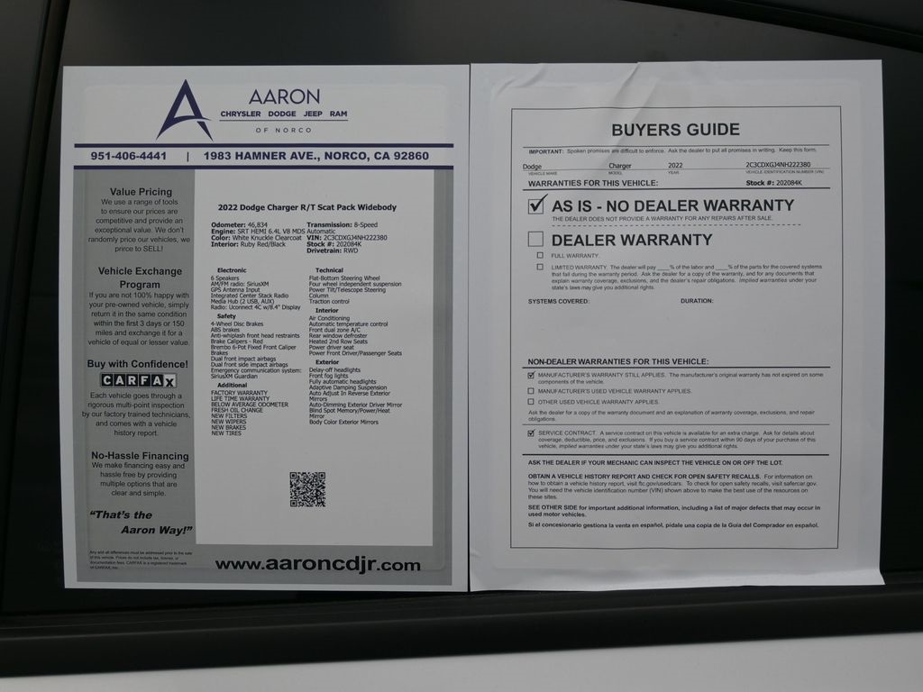FACTORY WARRANTY, FRESH OIL CHANGE, NEW FILTERS, NEW WIPERS, NEW TIRES, Charger R/T Scat Pack Widebody, 4D Sedan, SRT HEMI 6.4L V8 MDS, 8-Speed Automatic, RWD, Ruby Red/Black Artificial Leather, Adaptive Damping Suspension, All Speed Traction Control, Alloy wheels, Apple CarPlay/Android Auto, Auto Adjust In Reverse Exterior Mirrors, Auto-Dimming Exterior Driver Mirror, Black-Edged Premium Floormats, Blind Spot & Cross Path Detection, Blind Spot Memory/Power/Heat Mirror, Body Color Exterior Mirrors, Body Color Fender Flares, Brembo 6-Pot Fixed Front Caliper Brakes, Compass, Driver & Passenger Lower LED Lamps, Exterior Mirrors Courtesy Lamps, Exterior Mirrors w/Heating Element, Flat-Bottom Steering Wheel, Front dual zone A/C, Front fog lights, Front Overhead LED Lighting, GPS Antenna Input, Heated 2nd Row Seats, Heated Front Seats, Illuminated Rear Cupholders, Knee airbag, Low tire pressure warning, Media Hub (2 USB, AUX), ParkView Rear Back-Up Camera, Performance Shift Indicator, Plus Group, Power 2-Way Driver Lumbar Adjust, Power 2-Way Passenger Lumbar Adjust, Power Front Driver/Passenger Seats, Power Tilt/Telescope Steering Column, Premium-Stitched Dash Panel, Quick Order Package 21V Scat Pack Widebody, Radio: Uconnect 4C w/8.4" Display, Radio/Driver Seat/Mirrors Memory, Rear Seat Armrest w/Storage Cupholder, Rhombi 2-Pc Wheel Center Cap, Scat Pack Logo Nappa/Alcantara Seat, Ventilated Front Seats, Widebody Competition Suspension, Widebody Package.CARFAX One-Owner.