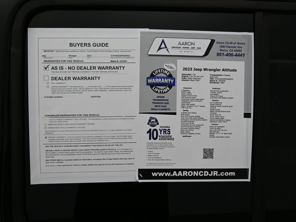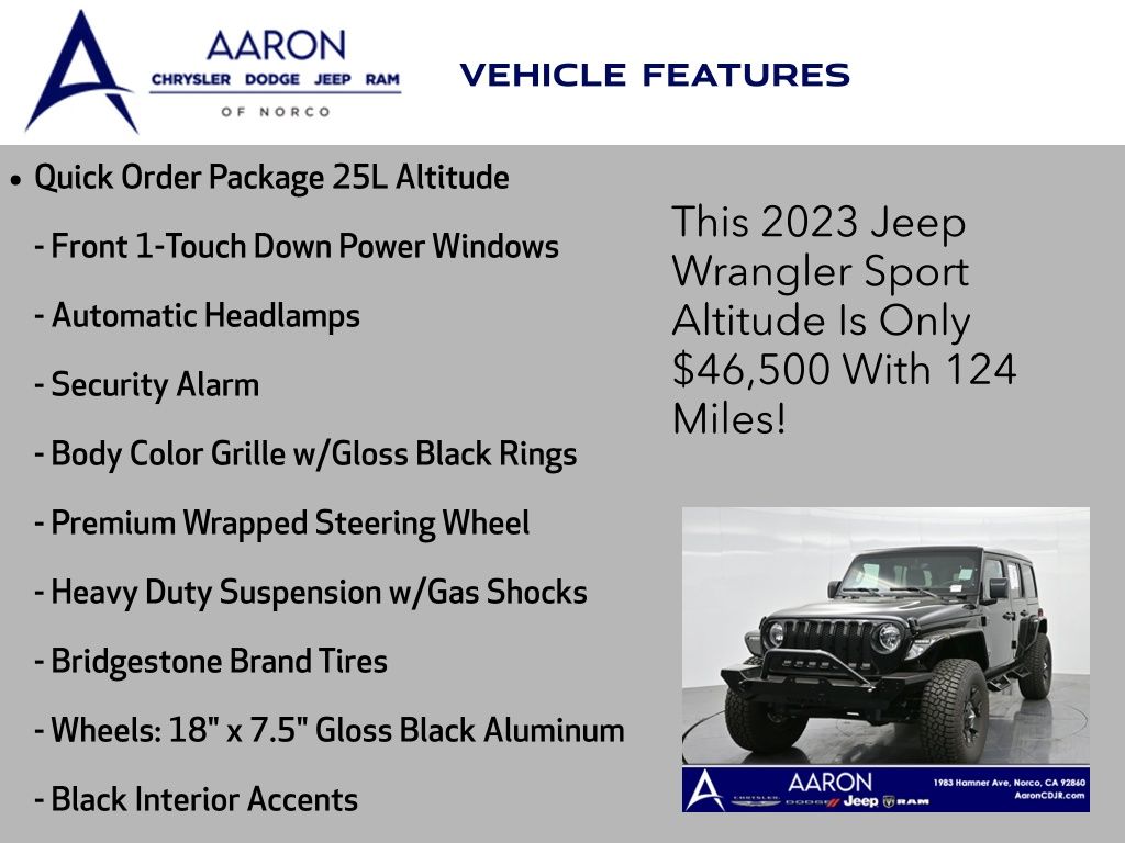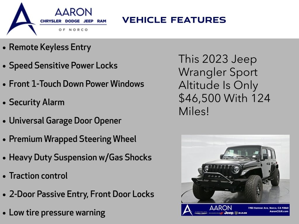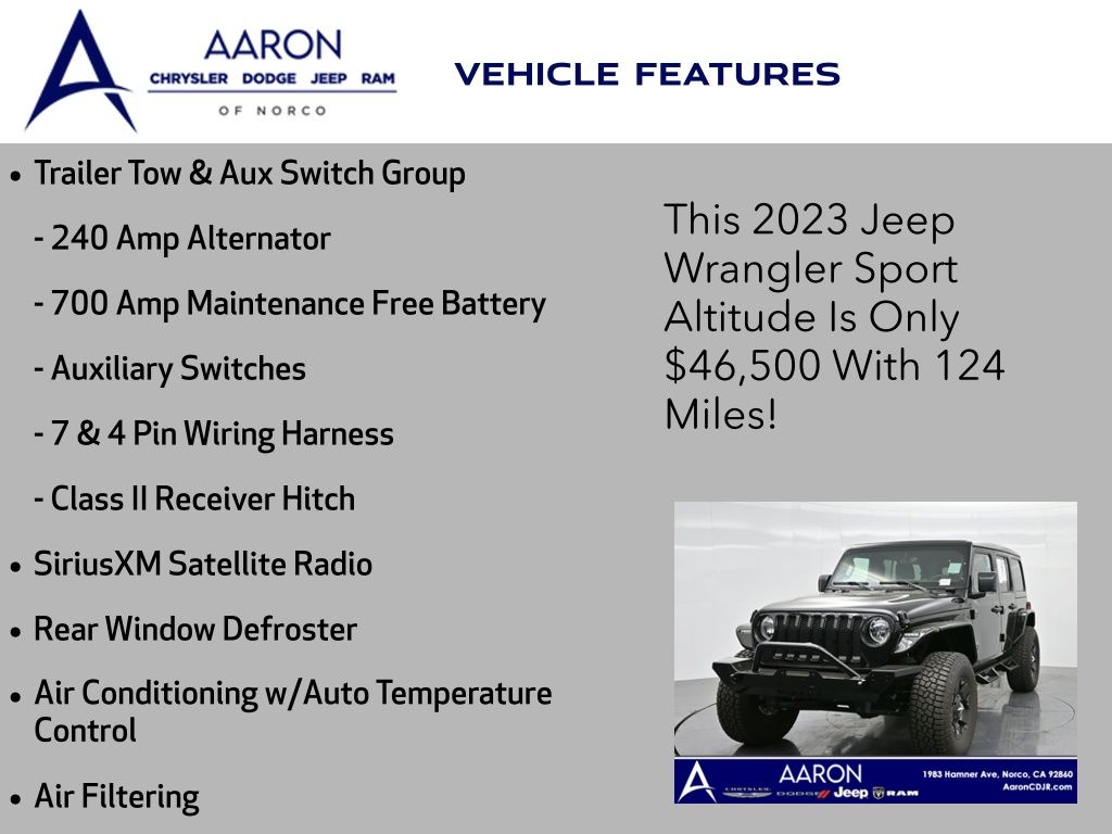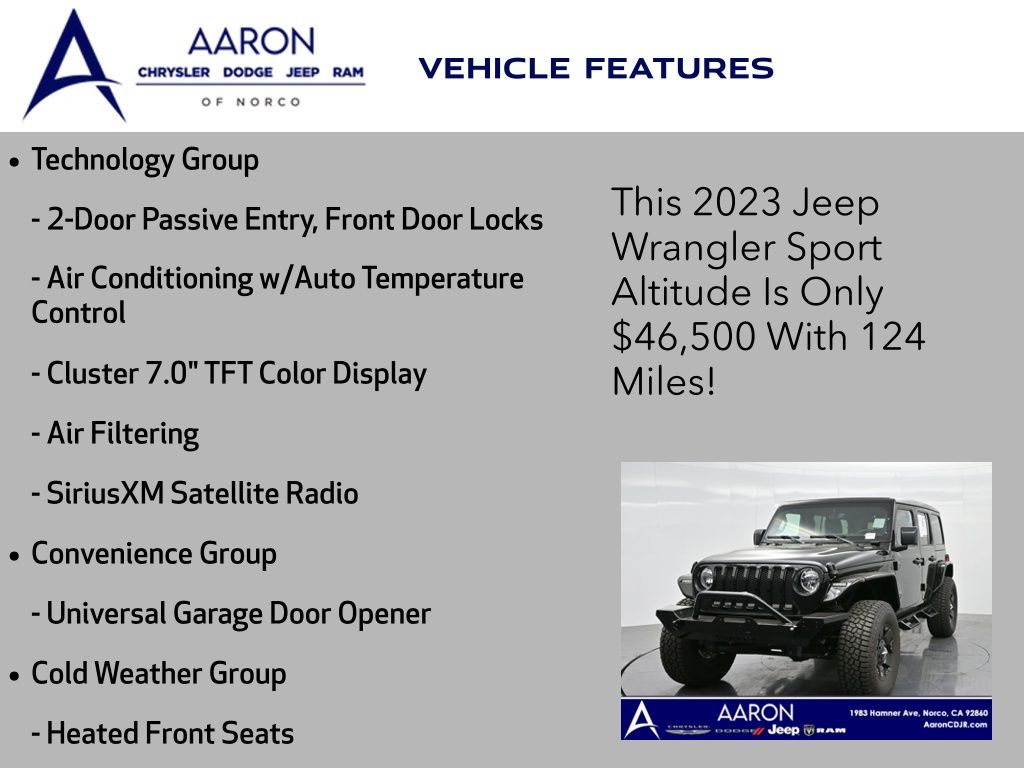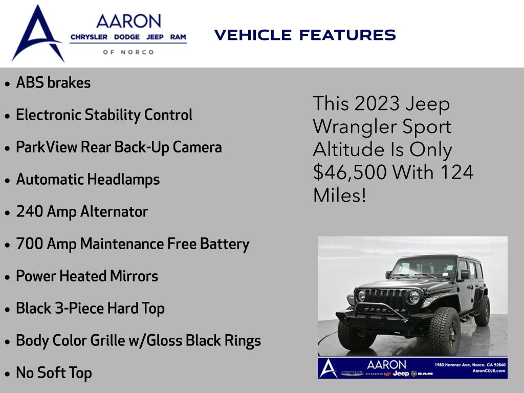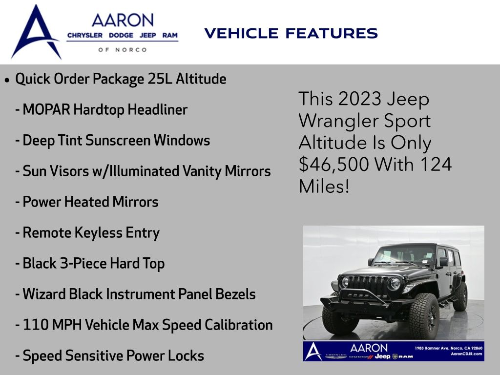 Wrangler Altitude, 4D Sport Utility, 3.6L V6 24V VVT, 8-Speed Automatic, 4WD, 110 MPH Vehicle Max Speed Calibration, 2-Door Passive Entry, Front Door Locks, 240 Amp Alternator, 7 & 4 Pin Wiring Harness, 700 Amp Maintenance Free Battery, ABS brakes, Air Conditioning w/Auto Temperature Control, Air Filtering, Automatic Headlamps, Auxiliary Switches, Black 3-Piece Hard Top, Black Interior Accents, Body Color Grille w/Gloss Black Rings, Bridgestone Brand Tires, Class II Receiver Hitch, Cluster 7.0" TFT Color Display, Cold Weather Group, Compass, Convenience Group, Deep Tint Sunscreen Windows, Electronic Stability Control, Freedom Panel Storage Bag, Front 1-Touch Down Power Windows, Heated Front Seats, Heated Steering Wheel, Heavy Duty Suspension w/Gas Shocks, Low tire pressure warning, MOPAR Hardtop Headliner, No Soft Top, ParkView Rear Back-Up Camera, Power Heated Mirrors, Premium Wrapped Steering Wheel, Quick Order Package 25L Altitude, Rear Window Defroster, Rear Window Wiper/Washer, Remote Keyless Entry, Security Alarm, SiriusXM Satellite Radio, Speed Sensitive Power Locks, Sun Visors w/Illuminated Vanity Mirrors, Technology Group, Traction control, Trailer Tow & Aux Switch Group, Universal Garage Door Opener, Wheels: 18" x 7.5" Gloss Black Aluminum, Wizard Black Instrument Panel Bezels.Clean CARFAX.