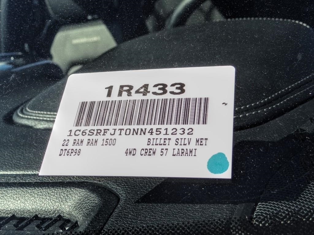 Billet Silver Metallic Clearcoat 2022 Ram 1500 Laramie 4WD 8-Speed Automatic HEMI 5.7L V8 Multi Displacement VVT Price includes: $1500 - California BC Regional Bonus Cash CACN2U. Exp. 11/30/2022 $500 - 2022 FIRST RESPONDER BONUS CONSUMER CASH 47CNA9. Exp. 01/03/2023