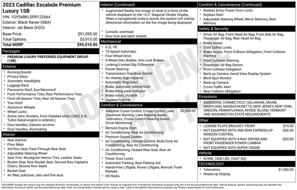 Priced below KBB Fair Purchase Price!FACTORY WARRANTY, FRESH OIL CHANGE, NEW FILTERS, NEW WIPERS, Escalade Premium Luxury, 4D Sport Utility, 6.2L V8, 10-Speed Automatic, AWD, Adaptive Cruise Control, AKG Studio 19-Speaker Audio System, Alloy wheels, Apple CarPlay/Android Auto, Automatic Seat Belt Tightening, Door Lock & Latch Shields, Dual front side impact airbags, Enhanced Automatic Emergency Braking, Enhanced Automatic Parking Assist, Exterior Parking Camera Rear, Front dual zone A/C, Glass Breakage Sensor, Heads-Up Display, Heated & Ventilated Driver & Front Passenger Seats, Lane Change Alert w/Side Blind Zone Alert, Mechanical Limited-Slip Differential, Memory seat, Navigation System, Overhead airbag, Power Liftgate, Power Panoramic Tilt-Sliding Sunroof, Preferred Equipment Group 1SB, Rear Camera Mirror, Rear Camera Mirror Washer, Rear Cross Traffic Alert, Reconfigurable Full-Color Head-Up Display, Reverse Automatic Braking, Running Board Assist Steps, Spoiler, Theft-Deterrent Alarm System, Vehicle Inclination Sensor, Vehicle Interior Movement Sensor, Wheels: 22" 14-Spoke Alloy w/Polished Finish.