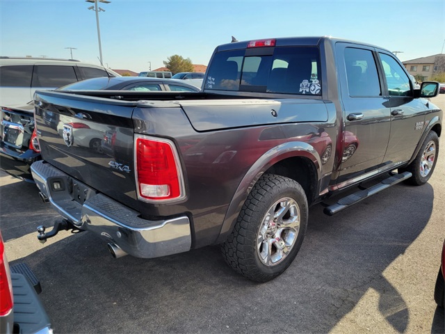 Recent Arrival!Priced below KBB Fair Purchase Price!Odometer is 12373 miles below market average!Granite Crystal Metallic Clearcoat 2015 Ram 1500 Laramie 4WD 8-Speed Automatic HEMI 5.7L V8 Multi Displacement VVTIf you don't drive here, you can't save here!Awards: * 2015 KBB.com Best Buy Awards Finalist * Green Car Journal 2015 Green Truck of the Year * 2015 KBB.com 15 Best Family CarsBased on 2017 EPA mileage ratings. Use for comparison purposes only. Your mileage will vary depending on how you drive and maintain your vehicle, driving conditions and other factors.Price may not include recon fee. Convenience Group (Auto High Beam Headlamp Control, Keyless Enter-N-Go, Rain Sensitive Windshield Wipers, and Remote Proximity Keyless Entry), Protection Group (Tow Hooks), Quick Order Package 26H Laramie, 1 Yr. Trial (Registration Required), 10 Speakers, 115V Auxiliary Power Outlet, 20" x 9" Chrome Clad Aluminum Wheels, 3.21 Rear Axle Ratio, 4-Wheel Disc Brakes, 5-Year SIRIUSXM Traffic Service, 5-Year SIRIUSXM Travel Link Service, 8.4" Touchscreen Display, ABS brakes, Active Grille Shutters, Adjustable pedals, Air Conditioning, Alloy wheels, AM/FM radio, Anti-Spin Differential Rear Axle, Audio memory, Auto-dimming door mirrors, Auto-dimming Rear-View mirror, Automatic temperature control, Brake assist, Bumpers: chrome, Center Hub, Compass, Delay-off headlights, Driver door bin, Driver vanity mirror, Dual front impact airbags, Dual front side impact airbags, Electronic Shift, Electronic Stability Control, Emergency communication system, Folding Flat Load Floor Storage, Front anti-roll bar, Front Center Armrest w/Storage, Front dual zone A/C, Front fog lights, Front reading lights, Front wheel independent suspension, Fully automatic headlights, Garage door transmitter, GPS Antenna Input, GPS Navigation, Harman Radio Manufacturer, HD Radio, Heated door mirrors, Heated Front Seats, Heated front seats, Heated steering wheel, High Back Seats, Illuminated entry, Integrated Voice Command w/Bluetooth, Leather steering wheel, Leather Trim 40/20/40 Bench Seat, Low tire pressure warning, Media Hub (SD, USB, AUX), Memory seat, Occupant sensing airbag, Outside temperature display, Overhead airbag, Overhead console, Panic alarm, ParkSense Front/Rear Park Assist System, ParkView Rear Back-Up Camera, Passenger door bin, Passenger vanity mirror, Pedal memory, Power 10-Way Memory Driver & 6-Way Passenger Seats, Power door mirrors, Power driver seat, Power passenger seat, Power steering, Power windows, Radio data system, Radio: Uconnect 8.4A AM/FM/SXM/BT, Radio: Uconnect 8.4AN AM/FM/SXM/HD/BT/NAV, RamBox Cargo Management System, Rear 60/40 Split Folding Seat, Rear anti-roll bar, Rear seat center armrest, Rear step bumper, Remote keyless entry, Remote Start System, Security system, SIRIUSXM Satellite Radio, SIRIUSXM Traffic, SIRIUSXM Travel Link, Speed control, Split folding rear seat, Spray In Bedliner, Steering wheel mounted audio controls, Tachometer, Tilt steering wheel, Tip Start, Traction control, Tri-Fold Tonneau Cover, Trip computer, Turn signal indicator mirrors, Uconnect Access, Uconnect Access 1 Year Trial, Variably intermittent wipers, Ventilated Front Seats, Ventilated front seats, and Voltmeter.