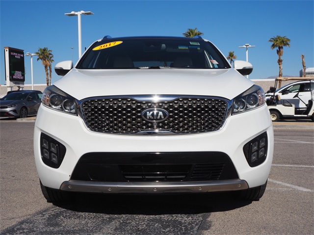 Priced below KBB Fair Purchase Price!Odometer is 4162 miles below market average!Snow White Pearl 2017 Kia Sorento SXL FWD 6-Speed Automatic with Sportmatic 3.3L DOHCIf you don't drive here, you can't save here!Awards: * 2017 KBB.com 10 Most Awarded BrandsPrice may not include recon fee. 10 Speakers, 3.32 Axle Ratio, 3rd row seats: split-bench, 4-Wheel Disc Brakes, ABS brakes, Air Conditioning, Alloy wheels, AM/FM radio: SiriusXM, Anti-whiplash front head restraints, Auto-dimming Rear-View mirror, Automatic temperature control, Blind spot sensor: warning, Brake assist, Bumpers: body-color, Cargo Net, CD player, Chrome wheels, Delay-off headlights, Distance-Pacing Cruise Control, Driver door bin, Driver vanity mirror, Dual front impact airbags, Dual front side impact airbags, Electronic Stability Control, Emergency communication system, Four wheel independent suspension, Front anti-roll bar, Front Bucket Seats, Front Center Armrest, Front dual zone A/C, Front fog lights, Front reading lights, Fully automatic headlights, Garage door transmitter: HomeLink, Heated & Ventilated Front Bucket Seats, Heated door mirrors, Heated front seats, Heated rear seats, Heated steering wheel, High-Intensity Discharge Headlights, Illuminated entry, Leather steering wheel, Low tire pressure warning, Memory seat, MP3 decoder, Nappa Leather Seat Trim, Navigation System, Occupant sensing airbag, Outside temperature display, Overhead airbag, Overhead console, Panic alarm, Passenger door bin, Passenger vanity mirror, Power door mirrors, Power driver seat, Power Liftgate, Power moonroof, Power passenger seat, Power steering, Power windows, Radio: AVN 4.0 Navigation System, Rear air conditioning, Rear anti-roll bar, Rear Parking Sensors, Rear reading lights, Rear seat center armrest, Rear window defroster, Rear window wiper, Remote keyless entry, Remote Start (Push Button), Roof rack: rails only, Security system, Speed control, Speed-sensing steering, Split folding rear seat, Spoiler, Steering wheel mounted audio controls, Sun blinds, SXL Ivory Nappa Leather Seat Trim, Tachometer, Telescoping steering wheel, Tilt steering wheel, Traction control, Trip computer, Turn signal indicator mirrors, Variably intermittent wipers, Ventilated front seats, and Wheels: 19" x 7.5 10-Spoke Chrome Alloy.