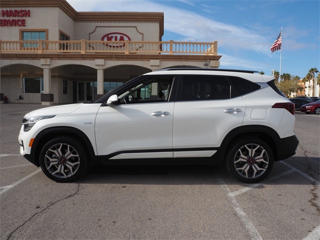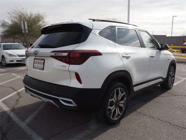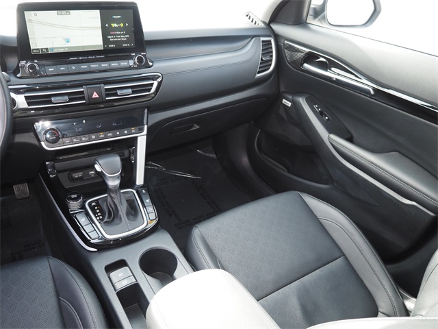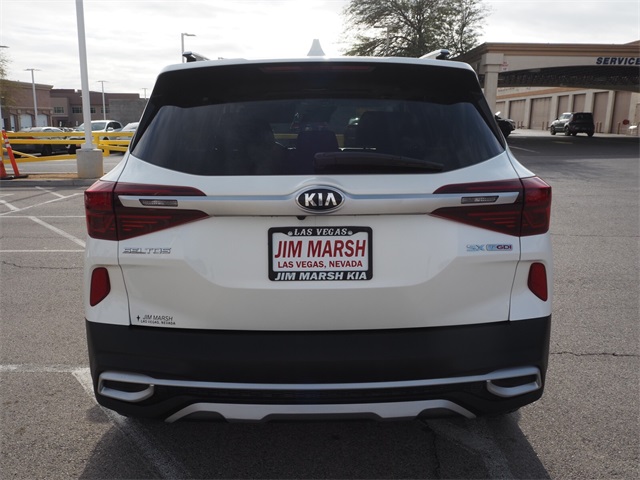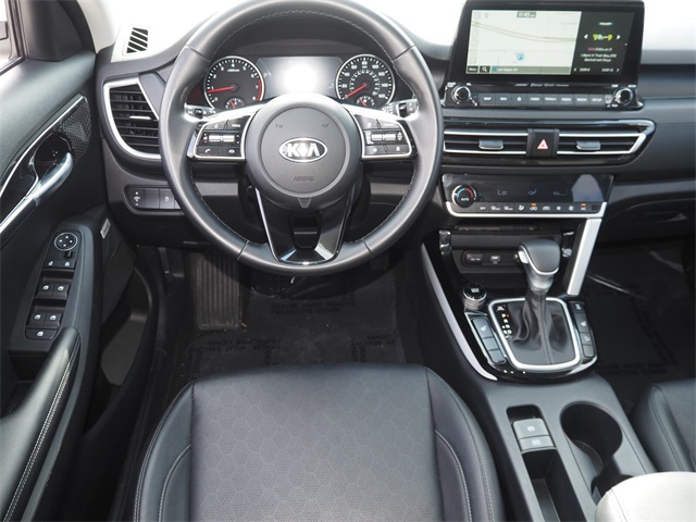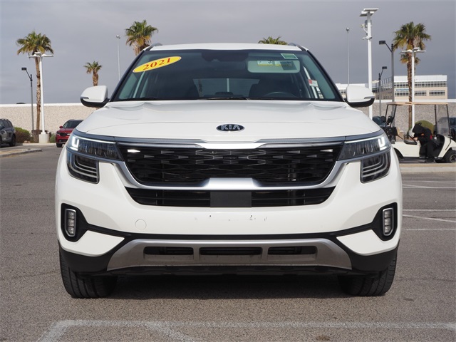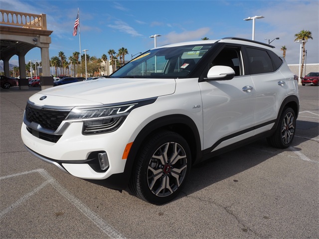 CARFAX One-Owner.25/30 City/Highway MPGSnow White Pearl 2021 Kia Seltos SX AWD 7-Speed Automatic I4If you don't drive here, you can't save here!Price may not include recon fee. SX Sunroof Package (Sunroof), 18" Alloy Wheels, 4.643 Axle Ratio, 4-Wheel Disc Brakes, 8 Speakers, ABS brakes, Air Conditioning, Alloy wheels, AM/FM radio: SiriusXM, Apple CarPlay & Android Auto, Auto-dimming Rear-View mirror, Automatic temperature control, Brake assist, Bumpers: body-color, Cargo Tray, Carpeted Floor Mats, Delay-off headlights, Driver door bin, Driver vanity mirror, Dual front impact airbags, Dual front side impact airbags, Electronic Stability Control, Emergency communication system, Exterior Parking Camera Rear, Four wheel independent suspension, Front anti-roll bar, Front Bucket Seats, Front Center Armrest, Front fog lights, Front reading lights, Fully automatic headlights, Heated door mirrors, Heated Front Bucket Seats, Heated front seats, Illuminated entry, Leather Seat Trim, Leather Shift Knob, Low tire pressure warning, Navigation System, Occupant sensing airbag, Outside temperature display, Overhead airbag, Overhead console, Panic alarm, Passenger door bin, Passenger vanity mirror, Power door mirrors, Power driver seat, Power steering, Power windows, Radio: AM/FM/MP3 Display Audio, Rear seat center armrest, Rear window defroster, Rear window wiper, Remote keyless entry, Roof rack: rails only, Security system, Speed control, Speed-sensing steering, Split folding rear seat, Spoiler, Steering wheel mounted audio controls, Tachometer, Telescoping steering wheel, Tilt steering wheel, Traction control, Trip computer, Turn signal indicator mirrors, and Variably intermittent wipers.