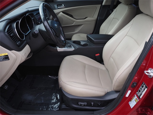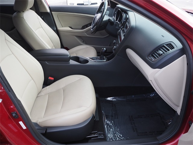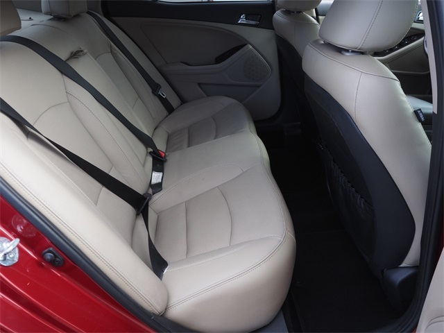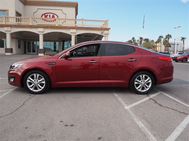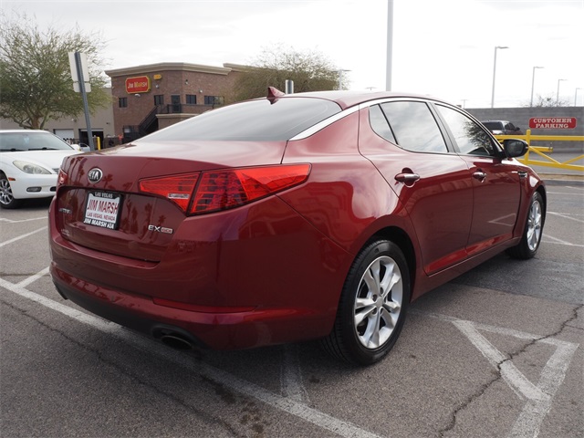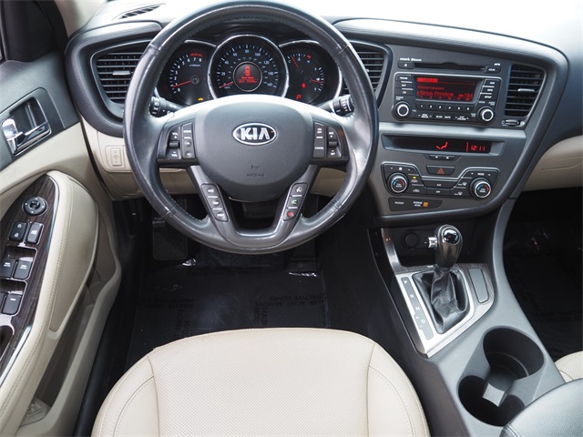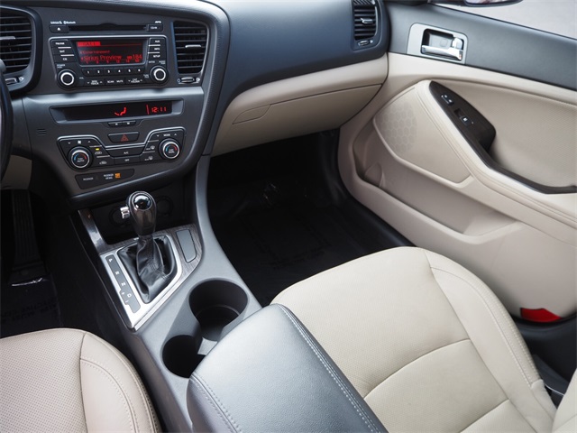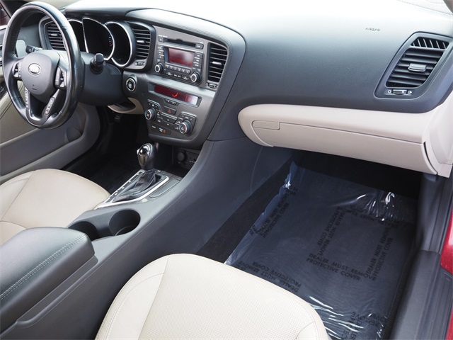 CARFAX One-Owner.Odometer is 30584 miles below market average!24/35 City/Highway MPGRemington Red Metallic 2013 Kia Optima EX FWD 6-Speed Automatic with Sportmatic 2.4L I4 DGI DOHC Beige.If you don't drive here, you can't save here!Awards: * 2013 IIHS Top Safety Pick * 2013 KBB.com 10 Best New Sedans Under $25,000 * 2013 KBB.com 10 Best Late-Model Used Cars Under $15,000Price may not include recon fee. Beige, 17" x 6.5J Alloy Painted Silver Wheels, 4-Wheel Disc Brakes, 6 Speakers, ABS brakes, Air Conditioning, Alloy wheels, AM/FM radio: SiriusXM, Auto-dimming Rear-View mirror, Automatic temperature control, Brake assist, Bumpers: body-color, Cargo Mat, Cargo Net, CD player, Compass, Delay-off headlights, Door Sill Applique, Driver door bin, Driver vanity mirror, Dual front impact airbags, Dual front side impact airbags, Electronic Stability Control, Four wheel independent suspension, Front anti-roll bar, Front Bucket Seats, Front Center Armrest, Front dual zone A/C, Front fog lights, Front reading lights, Fully automatic headlights, Garage door transmitter: HomeLink, Heated door mirrors, Illuminated entry, iPod Cable, Leather Seat Trim, Low tire pressure warning, MP3 decoder, Occupant sensing airbag, Outside temperature display, Overhead airbag, Overhead console, Panic alarm, Passenger door bin, Passenger vanity mirror, Power door mirrors, Power driver seat, Power steering, Power windows, Radio: AM/FM/CD/MP3 Capacity w/Satellite Audio, Rear anti-roll bar, Rear Bumper Applique, Rear reading lights, Rear seat center armrest, Rear window defroster, Remote keyless entry, Security system, Speed control, Speed-sensing steering, Split folding rear seat, Steering wheel mounted audio controls, Tachometer, Telescoping steering wheel, Tilt steering wheel, Traction control, Trip computer, Turn signal indicator mirrors, Variably intermittent wipers, and Wheel Locks.