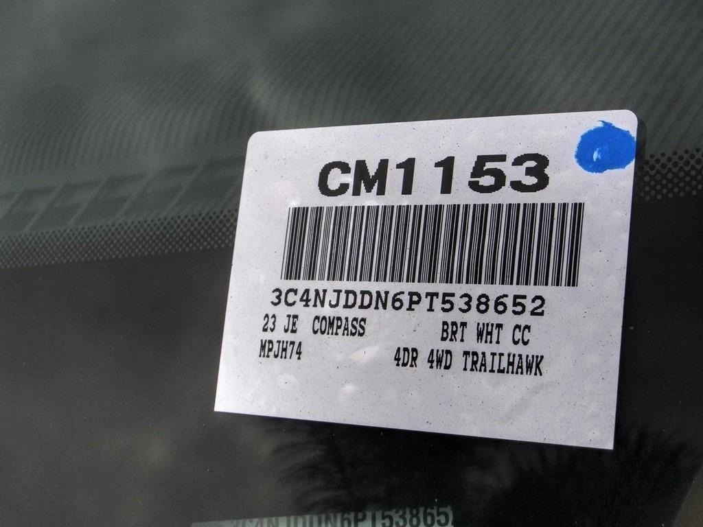 Bright White Clearcoat 2023 Jeep Compass Trailhawk 4WD 8-Speed Automatic 2.0L I4 DOHC 4WD.24/32 City/Highway MPG Price includes: 10% Msrp - 2023 Jeep Standalone 10% Off MSRP Retail Bonus Cash 28CPK. Exp. 10/02/2023