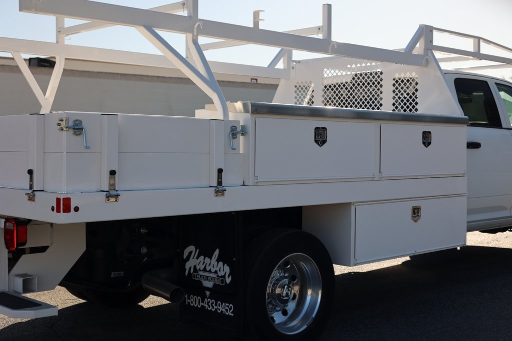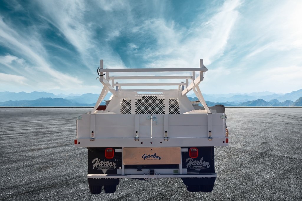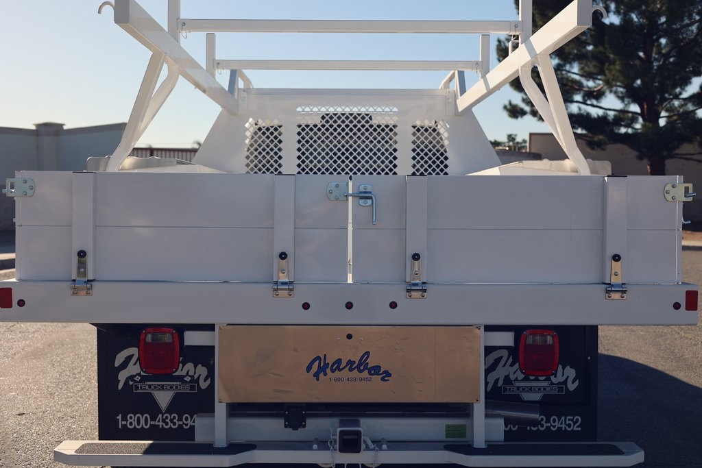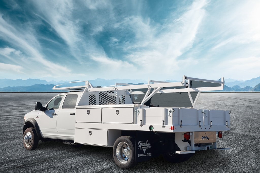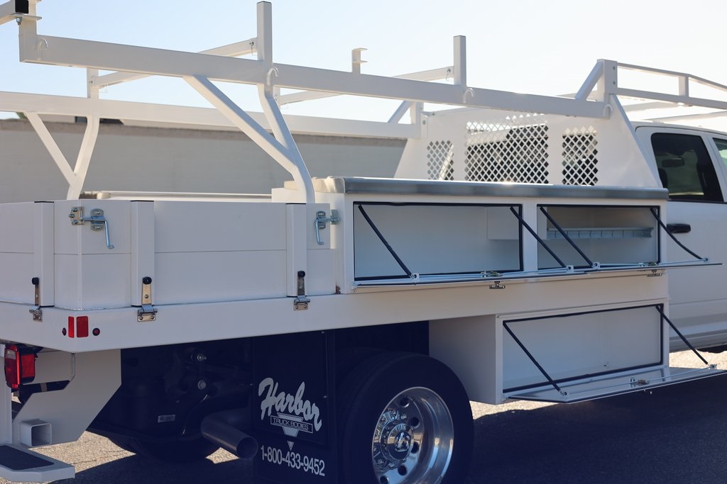12ft Harbor Contractor Flatbed, Steel Plate Floor, Dual 8' Top Boxes, Fold Down Gates, Dual 5' Underbed Boxes, Side Loader Overcab Rack w/ Hooks and Swing Away Forklift Load Bars, 34" Stainless Covered Rear Dock Bumper, Fold Down Steel Gates, 2.5" Class V Tube Receiver w/ 2" Sleeve, and Backup Camera $1,000 - Exp. 01/02/2024