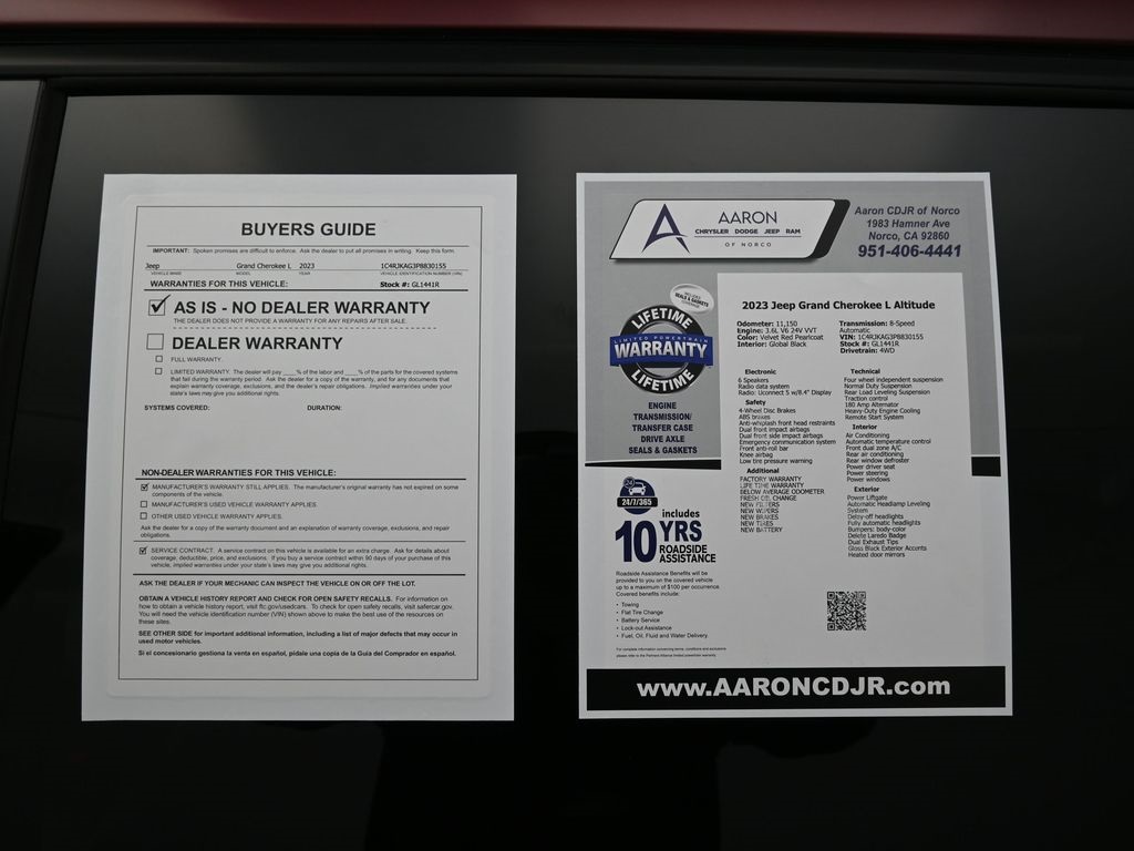 Priced below KBB Fair Purchase Price!FACTORY WARRANTY, LIFE TIME WARRANTY, FRESH OIL CHANGE, NEW FILTERS, NEW WIPERS, Grand Cherokee L Altitude, 4D Sport Utility, 3.6L V6 24V VVT, 8-Speed Automatic, 4WD, 115V Auxiliary Power Outlet, 180 Amp Alternator, 3rd Row Charge-Only USB Ports, 7 & 4 Pin Wiring Harness, Altitude Appearance Package, Automatic Headlamp Leveling System, Black Headliner, Capri Leatherette/Suede Seats, Class IV Receiver Hitch, Delete Laredo Badge, Dual Exhaust Tips, Front dual zone A/C, Gloss Black Exterior Accents, Heated Front Seats, Heated Steering Wheel, Heavy-Duty Engine Cooling, Knee airbag, Low tire pressure warning, Molded In Color Black/Gloss Black Roof Rails, Overhead airbag, ParkView Rear Back-Up Camera, Power Liftgate, Quick Order Package 23B Altitude, Radio: Uconnect 5 w/8.4" Display, Rain Sensitive Windshield Wipers, Rear Load Leveling Suspension, Remote Start System, Selectable Tire Fill Alert, Trailer Hitch Zoom, Trailer Tow Package, Wheels: 18" x 8.0" Fully Painted Aluminum 1, Wireless Charging Pad.For help with any Vehicle needs please call us directly at 951-621-1288.Clean CARFAX.CARFAX One-Owner.