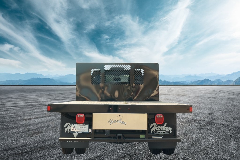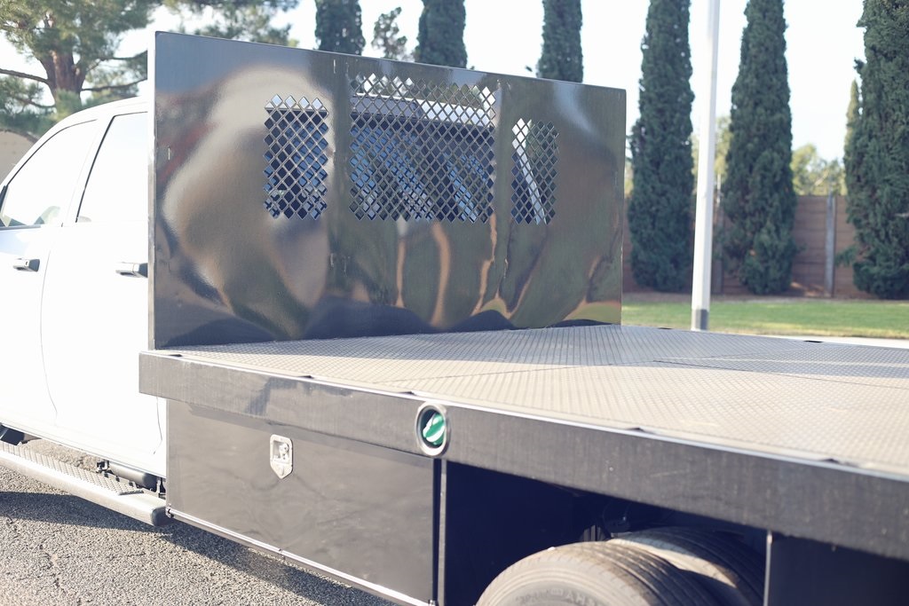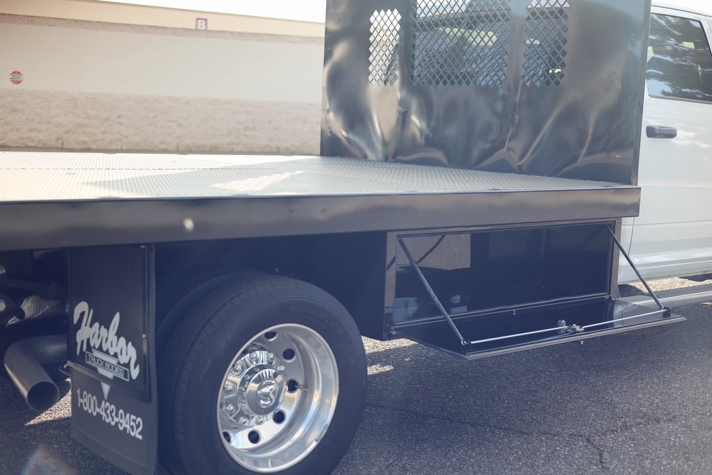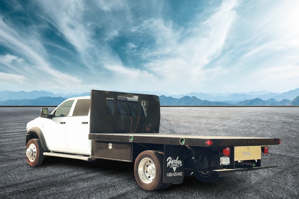 12ft Harbor Flatbed, Diamond Plate Deck, 42" High Bulkhead, Rope Hooks, Dual 5' Underbody Boxes, Stainless Steel Covered 34" Rear Dock Bumper, 2.5" Class V Tube Receiver w/ 2" Sleeve, and Backup Camera