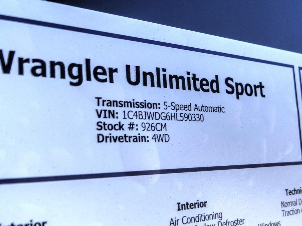 Priced below KBB Fair Purchase Price!CUSTOM BUILD, Wrangler Unlimited Sport, 4D Sport Utility, 3.6L V6 24V VVT, 5-Speed Automatic, 4WD, Granite Crystal Metallic Clearcoat, 17" x 7.5" Aluminum Wheels, Auto-Dimming Mirror w/Reading Lamp, Black 3-Piece Hard Top, Chrome/Leather Wrapped Shift Knob, Connectivity Group, Deep Tint Sunscreen Windows, Delete Sunrider Soft Top, Freedom Panel Storage Bag, Front 1-Touch Down Power Windows, Leather Wrapped Steering Wheel, Power Convenience Group, Power Heated Mirrors, Power Locks, Quick Order Package 24S, Rear Window Defroster, Rear Window Wiper/Washer, Remote Keyless Entry, Remote USB Port, Security Alarm, Tire Pressure Monitoring Display, Uconnect Voice Command w/Bluetooth, Vehicle Information Center.Type your sentence here.Clean CARFAX.Awards: * 2017 KBB.com 10 Most Awarded Brands