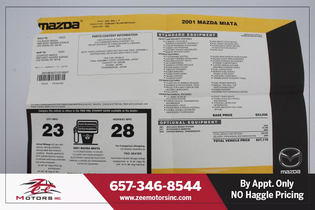 *We Work by Appointment Only* Please Call/Text us at 657-346-8544, Or email us at Sales@zeemotorsinc.com to schedule an appointment. *****Very clean Miata****Hard Top*****Soft top in excellent condition****Megan Racing Coilovers****K&N Cold Air Intake and filter*****Like new Continental tires*****Fresh oil change****** Clean Title. * Clean Carfax. * No Accidents.* Very Well-Maintained Vehicle, Service records available on CARFAX. * Very Clean Inside and Outside.* Passed Safety inspection and Smog Check.Attention to all buyers: All special prices are cash price and it does not include sales tax, license and registration fee, documentation fee, smog fee. Additional financing charges may apply on approved credit. While great effort is made to ensure the accuracy of the information provided on this site, errors do occur so please verify information with a team member. This is easily done by contacting us via phone or email.
