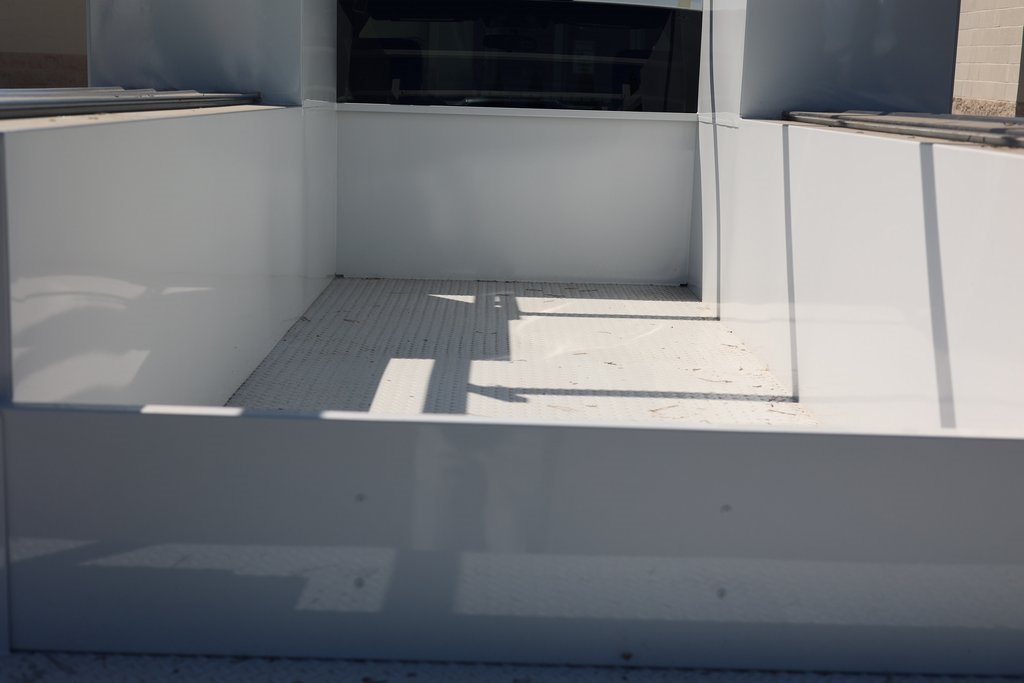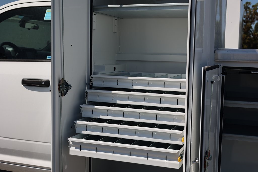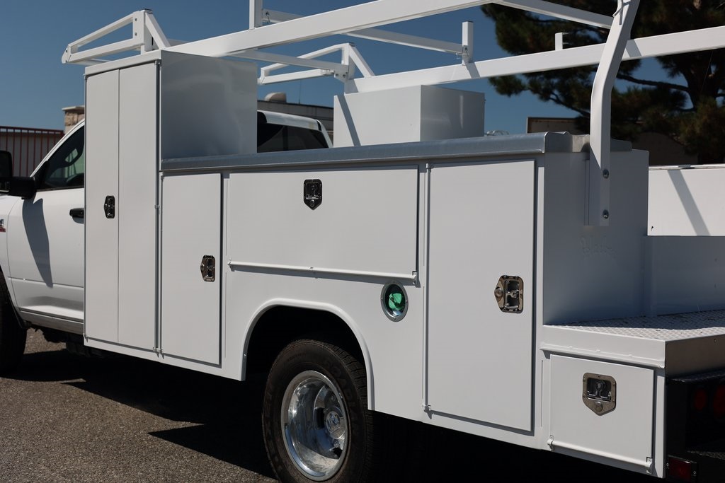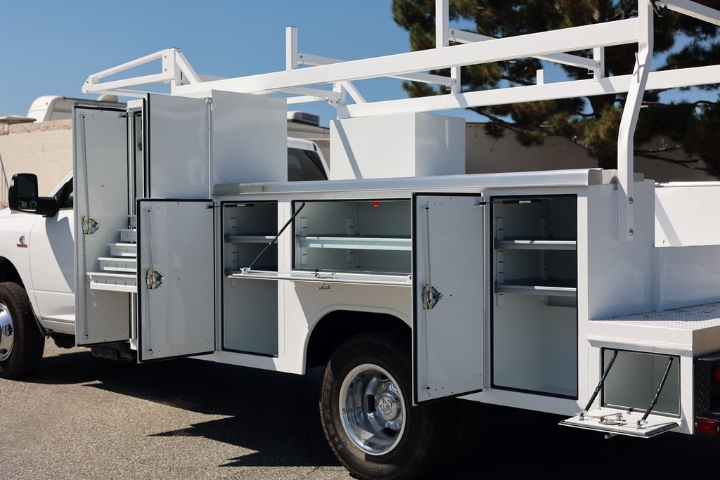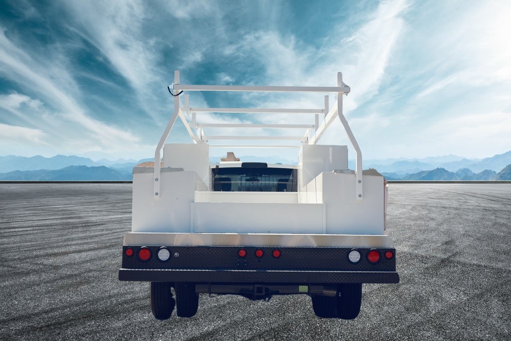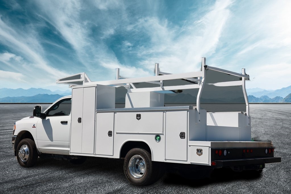 HARBOR 12ft Weldmaster, Dual Tank Cabinets w/ Tank Brackets, Roll Out Drawers, Rear Work Platform, Ladder Rack w/ Removable Crossbars, Class V Hitch, and Backup Camera.