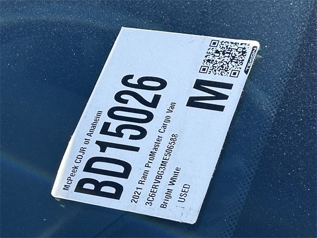 Odometer is 16883 miles below market average! Clean CARFAX. CARFAX One-Owner. INTERIOR & EXTERIOR PROFESSIONALLY DETAILED FOR DELIVERY, MCPEEK CHRYSLER DODGE JEEP RAM FAMILY OWNED AND OPERATED SINCE 1961 !!!!!.Bright White Clearcoat 2021 Ram ProMaster 1500 Base FWD 6-Speed AutomaticReceive Free lube and oil filter changes for up to 45,000 miles for 3 years!!! McPeek's Dodge of Anahiem 1221 S. Auto Center Drive Anahiem, CA 92806 714-262-4902.