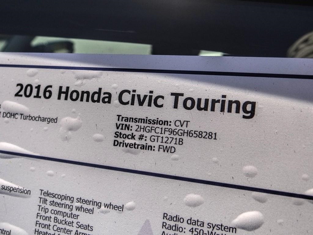 LIFE TIME WARRANTY, Civic Touring, 4D Sedan, 1.5L I-4 DI DOHC Turbocharged, CVT, FWD, Black, Black Leather, 10 Speakers, 17" Alloy Wheels, Active Cruise Control, Apple CarPlay/Android Auto, Compass, Exterior Parking Camera Rear, Heated front seats, Heated rear seats, Leather Seat Trim, Navigation System, Power driver seat, Power moonroof, Power passenger seat, Radio: 450-Watt AM/FM/HD/SiriusXM Audio System, Security system, Spoiler, Steering wheel mounted audio controls.CARFAX One-Owner.Awards: * 2016 IIHS Top Safety Pick+ (When equipped with honda sensing) * NACTOY 2016 North American Car of the Year * 2016 KBB.com Brand Image AwardsKelley Blue Book Brand Image Awards are based on the Brand Watch(tm) study from Kelley Blue Book Market Intelligence. Award calculated among non-luxury shoppers. For more information, visit www.kbb.com. Kelley Blue Book is a registered trademark of Kelley Blue Book Co., Inc.