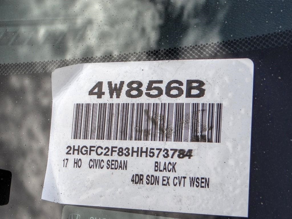 LIFE TIME WARRANTY, Civic EX w/Honda Sensing, 4D Sedan, 2.0L I4 DOHC 16V i-VTEC, CVT, FWD, Black, Black Cloth, 16" Alloy Wheels, 8 Speakers, Active Cruise Control, Apple CarPlay/Android Auto, Compass, Exterior Parking Camera Rear, Power moonroof, Radio: 180-Watt AM/FM/HD/SiriusXM Audio System, Remote keyless entry, Security system, Steering wheel mounted audio controls.Clean CARFAX.CARFAX One-Owner.Awards: * 2017 IIHS Top Safety Pick (When equipped with Honda Sensing) * 2017 KBB.com 10 Most Awarded Brands * 2017 KBB.com Brand Image AwardsKelley Blue Book Brand Image Awards are based on the Brand Watch(tm) study from Kelley Blue Book Market Intelligence. Award calculated among non-luxury shoppers. For more information, visit www.kbb.com. Kelley Blue Book is a registered trademark of Kelley Blue Book Co., Inc.