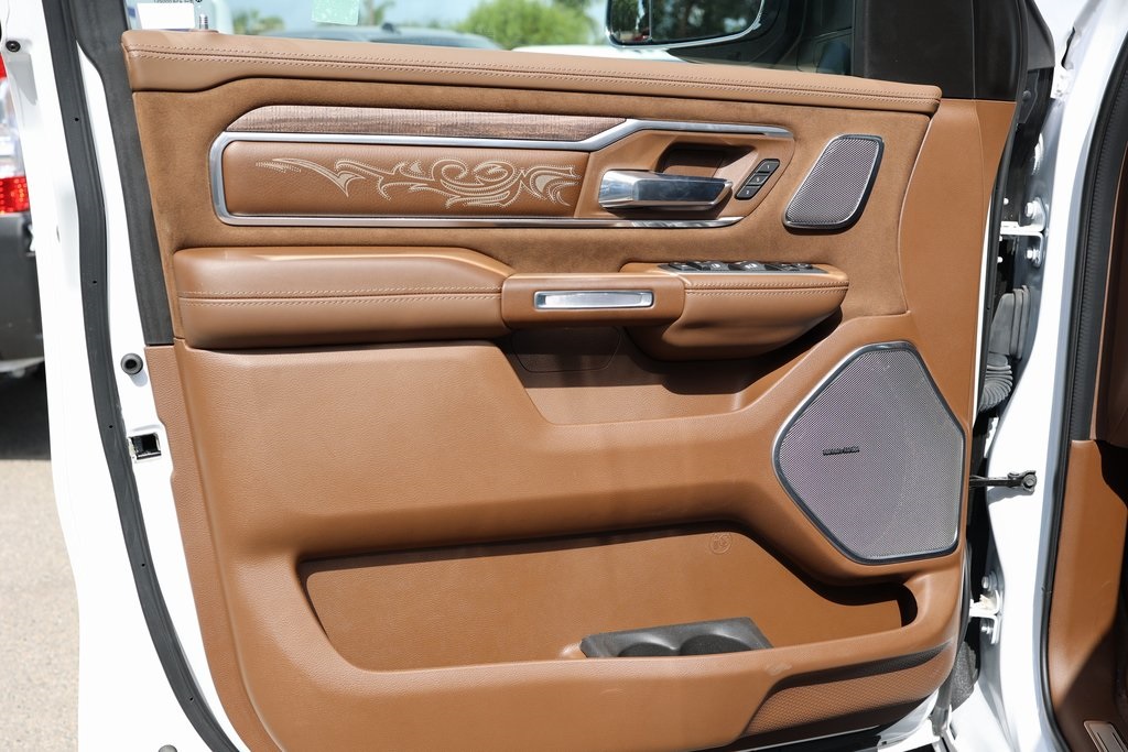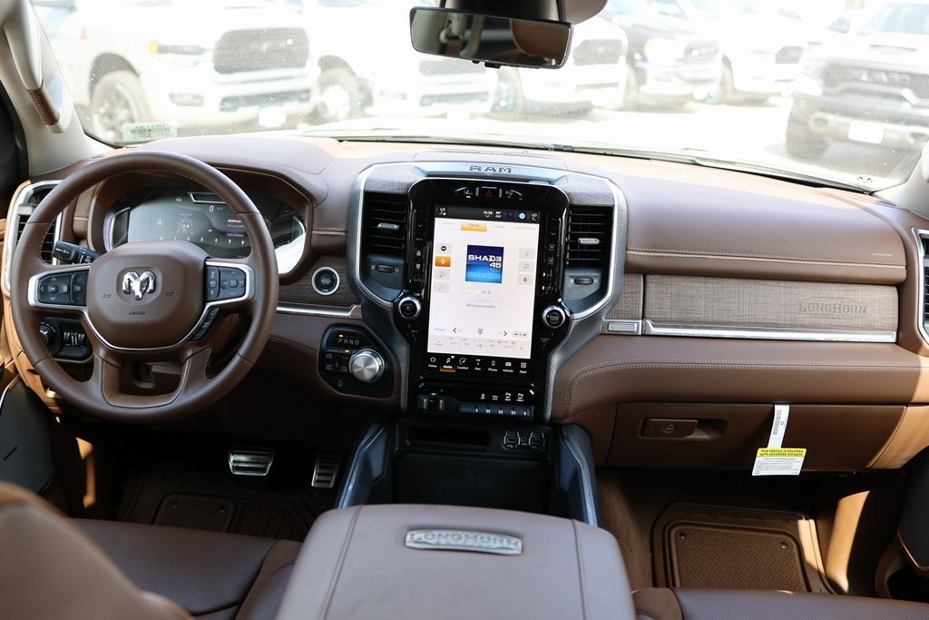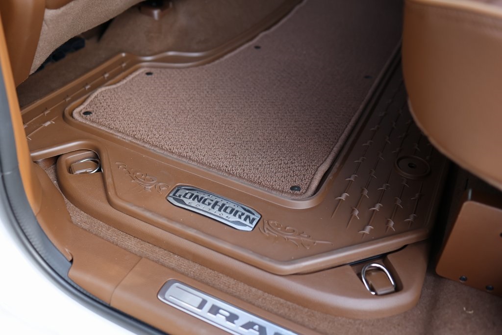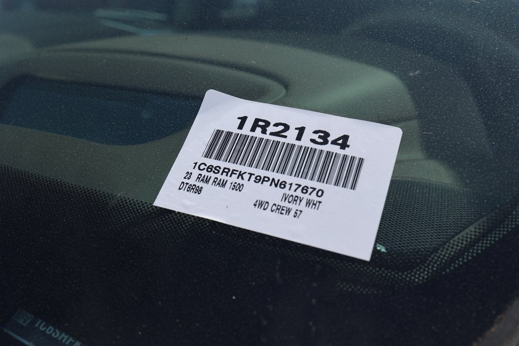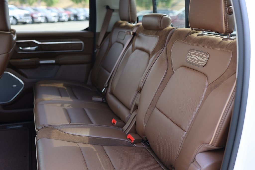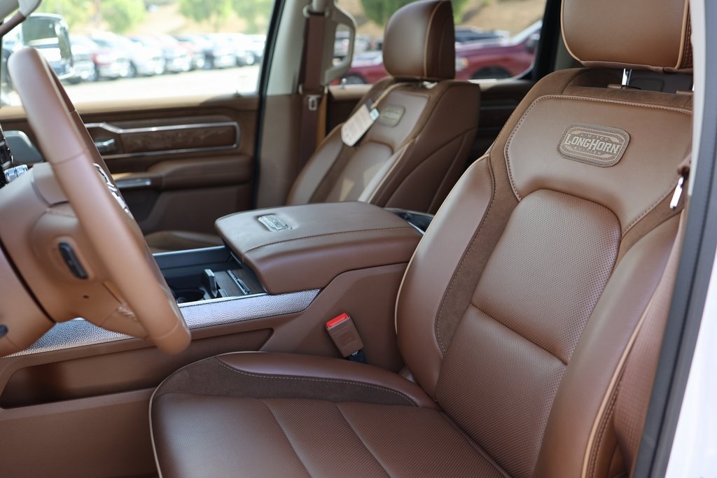 Ivory White Tri-Coat Pearlcoat 2023 Ram 1500 Laramie Longhorn 4WD 8-Speed Automatic HEMI 5.7L V8 Multi Displacement VVT eTorque #1 Seat Foam Cushion, 10 Speakers, 3 Rear Seat Head Restraints, 3.92 Rear Axle Ratio, 4 Way Front Headrests, Adaptive Cruise Control w/Stop & Go, Adjustable pedals, Anti-Spin Differential Rear Axle, Apple CarPlay/Android Auto, Auto-dimming door mirrors, Auto-dimming Rear-View mirror, Blind Spot & Cross Path Detection, Body Color Bumper Group, Body Color Front Bumper, Body Color Rear Bumper w/Step Pads, Bucket Seats, Compass, Digital Rearview Mirror, Driver Seat Memory, Exterior Mirrors w/Memory, Front Seat Back Map Pockets, Full Length Premium Floor Console, Garage door transmitter, harman/kardon 19 Speaker Premium Sound, Heads-Up Display, Heated Front Seats, Heated Second Row Seats, Heated Steering Wheel, Instrument Cluster Theme 6 - Limited Longhorn, Lane Keep Assist, LED CHMSL Lamp, Longhorn Level 1 Equipment Group, Memory seat, MOPAR Bright Pedal Kit, MOPAR Spray In Bedliner, Multi-Function Tailgate, Parallel & Perp Park Assist w/Stop, ParkSense Front/Rear Park Assist w/Stop, ParkView Rear Back-Up Camera, Pedal memory, Pedestrian Emergency Braking, Pick-Up Box Lighting, Power 4-Way Driver Lumbar Adjust, Power 4-Way Passenger Lumbar Adjust, Power 8-Way Driver & Passenger Seats, Power driver seat, Power Running Boards, Premium Leather Bucket Seats, Quick Order Package 27K Longhorn, Radio: Uconnect 5 Nav w/12.0" Display, Rear 60/40 Folding Split Recline Seat, Security system, Southfork Edition Group, Surround View Camera System, Tailgate Ajar Warning Lamp, Ventilated Front Seats, Ventilated Rear Seats, Wheels: 22" x 9" Polish/Painted w/Inserts, Wireless Charging Pad.