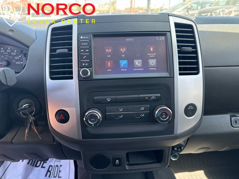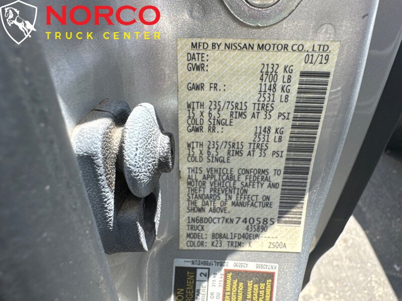<ul><li><P style= "BORDER-TOP-COLOR: ; BORDER-LEFT-COLOR: ; BORDER-BOTTOM-COLOR: ; BORDER-RIGHT-COLOR: " >YOU ARE LOOKING AT A 2019 NISSAN FRONTIER WITH A 2 DOOR CAB; KING CAB BODY. THIS VEHICLE HAS AN TRANSMISSION, L4, 2.5L ENGINE WITH 20823 MILES. THE DRIVETRAIN IS: RWD. PLEASE CALL NORCO TRUCK CENTER INC FOR MORE INFORMATION AT (951) 372-0354 OR COME SEE US AT ~ 2075 HAMNER AVE. NORCO, CA. 92860 ~ </P > <P style= "BORDER-TOP-COLOR: ; BORDER-LEFT-COLOR: ; BORDER-BOTTOM-COLOR: ; BORDER-RIGHT-COLOR: " > </P ></li></ul> -- INSTALLED FEATURES: Front air conditioning, Front air conditioning zones: single, Airbag deactivation: occupant sensing passenger, Front airbags: dual, Side airbags: front, Side curtain airbags: front / rear, Side-curtain airbag rollover sensor, Antenna type: mast, Auxiliary audio input: Bluetooth / USB / iPod/iPhone / jack, Radio: AM/FM / touch screen display, Radio data system, Speed sensitive volume control, Total speakers: 4, ABS: 4-wheel, Electronic brakeforce distribution, Front brake diameter: 11.1, Front brake type: ventilated disc, Front brake width: .7, Power brakes, Rear brake diameter: 11.3, Rear brake type: ventilated disc, Rear brake width: 0.71, Floor material: carpet, Interior accents: metallic-tone, Shift knob trim: urethane, Steering wheel trim: urethane, Assist handle: front, Center console: front console with armrest and storage, Cruise control, Cupholders: front / rear, Overhead console: front, Power outlet(s): two 12V front, Power steering: variable/speed-proportional, Reading lights: front, Rearview mirror: manual day/night, Retained accessory power, Steering wheel mounted controls: audio / cruise control / phone, Storage: door pockets / sunglasses holder / under rear seats, Sun visors, Side door type: dual rear-hinged access, Axle ratio: 4.08, Alternator: 110 amps, Battery saver, Spark plugs: platinum tipped, Door handle color: black, Front bumper color: black, Grille color: black / chrome surround, Mirror color: black, Pickup bed light, Rear bumper color: body-color, Rear spoiler: tail-gate, Rear spoiler color: black, Tailgate: removable, Window trim: black, Infotainment screen size: 7 in., Clock, Digital odometer, Gauge: tachometer, Trip odometer, Warnings and reminders: low fuel level / tire fill alert, Headlights: auto delay off / halogen, Side mirror adjustments: manual / manual folding, Active head restraints: dual front, Body side reinforcements: side impact door beams, Camera system: rearview, Child seat anchors: LATCH system, Crumple zones: front, Energy absorbing steering column, Rearview monitor: in dash, Emergency locking retractors: front, Front seatbelts: 3-point, Rear seatbelts: 3-point, Seatbelt force limiters: front, Seatbelt pretensioners: front, Seatbelt warning sensor: front, Driver seat manual adjustments: reclining / 4, Front headrests: adjustable / 2, Front seat type: bucket, Passenger seat manual adjustments: reclining / 4, Rear headrests: adjustable / 2, Rear seat folding: folds up, Rear seat type: jumpseats, Upholstery: cloth, Stability control, Traction control, Steering ratio: 20.4, Turns lock-to-lock: 3.6, Front shock type: gas, Front spring type: coil, Front stabilizer bar: diameter 34 mm, Front struts, Front suspension classification: independent, Front suspension type: double wishbone, Rear shock type: gas, Rear spring type: leaf, Rear suspension classification: solid live axle, Rear suspension type: multi-leaf, Electronic messaging assistance: voice operated / with read function, Phone: hands free, Satellite communications: voice guided directions, Wireless data link: Bluetooth, Spare tire mount location: underbody, Spare tire size: full-size, Spare wheel type: steel, Tire Pressure Monitoring System, Tire type: all season, Wheels: steel, Cargo tie downs, Front wipers: variable intermittent, Rear privacy glass