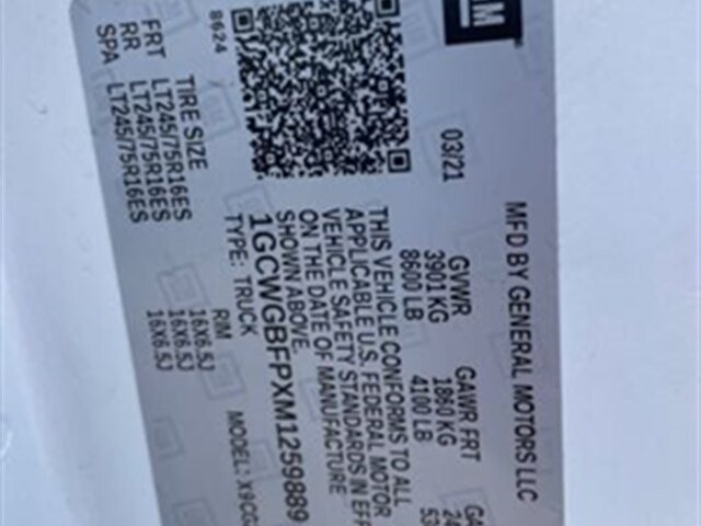 INSTALLED FEATURES: Front air conditioning, Front air conditioning zones: single, Airbag deactivation: passenger switch, Front airbags: dual, Side airbags: front, Side curtain airbags: front, Antenna type: mast, Auxiliary audio input: jack, Radio: AM/FM, Total speakers: 2, ABS: 4-wheel, Electronic brakeforce distribution, Front brake diameter: 12.8, Front brake type: ventilated disc, Front brake width: 1.5, Power brakes, Rear brake diameter: 13.0, Rear brake type: ventilated disc, Rear brake width: 1.14, Armrests: front center, Floor material: rubber/vinyl, Steering wheel trim: urethane, Assist handle: front, Cargo area light, Cupholders: front / 3, Power outlet(s): 115V front / 12V front, Power steering, Reading lights: front, Storage: cargo tie-down anchors and hooks / door pockets / in dash, Sun visors, Axle ratio: 3.42, Alternator: 105 amps, Auxiliary oil cooler, Battery: maintenance-free, Battery rating: 600 CCA, Battery saver, Bumper detail: rear step, Door handle color: black, Exhaust tip color: stainless steel, Front bumper color: black, Grille color: black, License plate bracket: front, Mirror color: black, Rear bumper color: black, Rear trunk/liftgate: barn, Side door type: passenger-side hinged swing-out, Window trim: black, Clock, Digital odometer, Fuel economy display: MPG / range, Gauge: oil pressure / tachometer, Multi-function display, Powertrain hour meter, Trip odometer, Warnings and reminders: low fuel level / maintenance due, Daytime running lights, Headlights: auto on/off / halogen, Side mirror adjustments: manual / manual folding, OEM roof height: undefined, Camera system: rearview, Child seat anchors, Rearview monitor: in mirror, Front seatbelts: 3-point, Seatbelt pretensioners: front, Driver seat manual adjustments: reclining / 4, Front headrests: integrated / 2, Front seat type: bucket, Passenger seat manual adjustments: reclining / 4, Upholstery: vinyl, Anti-theft system: alarm / vehicle immobilizer, Power door locks: anti-lockout, Hill holder control, Stability control, Traction control, Steering ratio: 17.2, Turns lock-to-lock: 3.0, Front shock type: gas, Front spring type: coil, Front stabilizer bar: diameter 35 mm, Front suspension classification: independent, Front suspension type: short and long arm, Rear shock type: gas, Rear spring type: leaf, Rear suspension classification: solid live axle, Rear suspension type: multi-leaf, Driver assistance app: roadside assistance, Satellite communications: OnStar / voice guided directions, Smart device app compatibility: myChevrolet with Connected Access, Smart device app function: maintenance status, Wi-Fi: hotspot, Spare tire mount location: underbody, Spare tire size: full-size matching, Spare wheel type: steel, Tire Pressure Monitoring System, Tire type: all season, Wheel covers: partial, Wheels: steel, Auxiliary transmission fluid cooler, Tow/Haul mode, Front wipers: intermittent, Power windows, Solar-tinted glass: front / rear, Window defogger: side