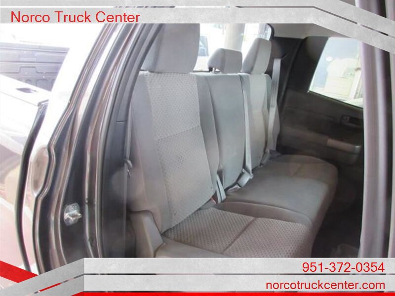 <ul><li><P style= "BORDER-TOP-COLOR: ; BORDER-LEFT-COLOR: ; BORDER-BOTTOM-COLOR: ; BORDER-RIGHT-COLOR: " >YOU ARE LOOKING AT A 2013 TOYOTA TUNDRA WITH A 4 DOOR CAB; DOUBLE CAB BODY. THIS VEHICLE HAS AN AT TRANSMISSION, V8, 4.6L ENGINE WITH 114614 MILES. THE DRIVETRAIN IS: RWD. PLEASE CALL NORCO TRUCK CENTER INC FOR MORE INFORMATION AT (951) 372-0354 OR COME SEE US AT ~ 2075 HAMNER AVE. NORCO, CA. 92860 ~ </P > <P style= "BORDER-TOP-COLOR: ; BORDER-LEFT-COLOR: ; BORDER-BOTTOM-COLOR: ; BORDER-RIGHT-COLOR: " > </P ></li></ul> -- INSTALLED FEATURES: Air filtration, Front air conditioning, Front air conditioning zones: dual, Airbag deactivation: passenger switch, Front airbags: dual, Knee airbags: dual front, Side airbags: front, Side curtain airbags: front / rear, Side-curtain airbag rollover sensor, Antenna type: diversity / mast, Auxiliary audio input: jack, In-Dash CD: MP3 Playback, Radio: AM/FM, Satellite radio: SiriusXM ready, Total speakers: 6, ABS: 4-wheel, Braking assist, Electronic brakeforce distribution, Front brake diameter: 13.9, Front brake type: ventilated disc, Power brakes, Rear brake diameter: 13.6, Rear brake type: ventilated disc, Floor material: carpet, Steering wheel trim: urethane, Cruise control, Cupholders: front / rear, Multi-function remote: keyless entry / panic alarm, One-touch windows: 1, Power outlet(s): 12V rear / two 12V front, Power steering, Power windows: lockout button, Reading lights: front / rear, Steering wheel mounted controls: paddle shifter, Storage: door pockets, Front bumper color: chrome, Grille color: chrome surround, Mirror color: black, Rear bumper color: chrome, Tailgate: lift assist, Clock, Gauge: tachometer, Multi-function display, Trip odometer, Warnings and reminders: coolant temperature warning / lamp failure / low fuel level / low oil pressure / tire fill alert, Daytime running lights, Headlights: halogen / manual leveling, Taillights: rear center, Side mirror adjustments: power, Side mirrors: heated, Body side reinforcements: side impact door beams, Child safety door locks, Child seat anchors: LATCH system, Safety brake pedal system, Emergency locking retractors: driver, Front seatbelts: 3-point, Rear seatbelts: 3-point, Seatbelt force limiters: front, Seatbelt pretensioners: front, Driver seat manual adjustments: 8, Front headrests: adjustable / 2, Front seat type: 40-20-40 split bench, Passenger seat manual adjustments: 4, Rear headrests: adjustable / 3, Rear seat folding: folds up, Rear seat type: 60-40 split bench, Upholstery: cloth, Power door locks: auto-locking, Stability control, Traction control, Trailer stability control, Steering ratio: 18.1, Turns lock-to-lock: 3.7, Front shock type: gas, Front spring type: coil, Front stabilizer bar: diameter 36 mm, Front struts, Front suspension classification: independent, Front suspension type: double wishbone, Rear shock type: gas, Rear spring type: leaf, Rear suspension classification: solid live axle, Rear suspension type: multi-leaf, Spare tire mount location: underbody, Spare tire size: full-size, Tire Pressure Monitoring System, Wheels: steel, Front wipers: variable intermittent, Power windows, Solar-tinted glass