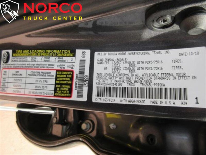 YOU ARE LOOKING AT A 2019 TOYOTA TACOMA WITH A 4 DOOR CAB; DOUBLE CAB; LONG WHEELBASE BODY. THIS VEHICLE HAS AN AUTOAMTIC TRANSMISSION, L4, 2.7L ENGINE WITH 51910 MILES. THE DRIVETRAIN IS: RWD. PLEASE CALL NORCO TRUCK CENTER INC FOR MORE INFORMATION AT (951) 372-0354 OR COME SEE US AT ~ 2075 HAMNER AVE. NORCO, CA. 92860 ~ -- INSTALLED FEATURES: Air filtration, Front air conditioning, Front air conditioning zones: single, Airbag deactivation: occupant sensing passenger, Front airbags: dual, Knee airbags: dual front, Side airbags: front, Side curtain airbags: front / rear, Side-curtain airbag rollover sensor, Antenna type: mast, Auxiliary audio input: Bluetooth / USB / iPod/iPhone / jack, In-Dash CD: single disc, Radio: AM/FM / touch screen display / voice operated, Radio data system, Speed sensitive volume control, Total speakers: 6, ABS: 4-wheel, Braking assist, Electronic brakeforce distribution, Front brake diameter: 10.8, Front brake type: ventilated disc, Power brakes, Rear brake diameter: 10.0, Rear brake type: drum, Floor material: carpet, Shift knob trim: urethane, Steering wheel trim: urethane, Adaptive cruise control, Assist handle: front / rear, Center console: front console with armrest and storage, Cupholders: front / rear, One-touch windows: 1, Overhead console: front, Power outlet(s): 12V front, Power steering: variable/speed-proportional, Power windows: lockout button, Reading lights: front / rear, Rearview mirror: manual day/night, Retained accessory power, Steering wheel: tilt and telescopic, Steering wheel mounted controls: audio / cruise control / multi-function / phone / voice control, Storage: door pockets / front seatback / grocery bag holder / sunglasses holder / under rear seats, Sun visors, Axle ratio: 4.30, Battery: maintenance-free, Battery saver, Spark plugs: iridium tipped, Bumper detail: rear step, Door handle color: body-color, Exhaust tip color: stainless-steel, Front bumper color: body-color, Grille color: black / black surround, Mirror color: body-color, Pickup bed light, Rear bumper color: body-color, Skid plate(s): front, Tailgate: removable, Tailgate protection cap, Window trim: black, Infotainment: Entune, Infotainment screen size: 6.1 in., Clock, Digital odometer, Driver information system, External temperature display, Fuel economy display: MPG / range, Gauge: tachometer, Instrument cluster screen size: 4.2 in., Multi-function display, Trip odometer, Warnings and reminders: coolant temperature warning / lamp failure / low fuel level / low oil pressure / maintenance due / tire fill alert, Daytime running lights, Headlights: auto delay off / auto high beam dimmer / halogen, Side mirror adjustments: manual folding / power, Side mirrors: heated, Active head restraints: dual front, Automatic emergency braking: front / front pedestrian, Body side reinforcements: side impact door beams, Camera system: rearview, Child safety door locks, Child seat anchors: LATCH system, Impact sensor: fuel cut-off, Lane deviation sensors, Pre-collision warning system: audible warning / pedestrian detection / visual warning, Rearview monitor: in dash, Safety brake pedal system, Emergency locking retractors: front / rear, Front seatbelts: 3-point, Rear seatbelts: 3-point, Seatbelt force limiters: front, Seatbelt pretensioners: front, Seatbelt warning sensor: front, Driver seat manual adjustments: lumbar / reclining / 4, Front headrests: adjustable / 2, Front seat type: bucket, Passenger seat manual adjustments: reclining / 4, Rear headrests: adjustable / foldable / 3, Rear seat folding: split, Rear seat type: 60-40 split bench, Upholstery: cloth, Anti-theft system: engine immobilizer, Power door locks: auto-locking, Hill holder control, Stability control, Traction control, Steering ratio: 17.4, Turns lock-to-lock: 3.40, Front shock type: gas, Front spring type: coil, Front stabilizer bar: diameter 30 mm, Front struts, Front suspension classification: independent, Front suspension type: double wishbone, Rear shock type: gas, Rear spring type: leaf, Rear stabilizer bar, Rear suspension classification: solid live axle, Rear suspension type: multi-leaf, Electronic messaging assistance: voice operated / with read function, Phone: hands free, Wireless data link: Bluetooth, Spare tire mount location: underbody, Spare tire size: full-size, Spare wheel type: steel, Tire Pressure Monitoring System, Tire type: all season, Wheels: steel, Cargo tie downs, Front wipers: intermittent, Pickup sliding rear window: manual, Power windows, Rear privacy glass