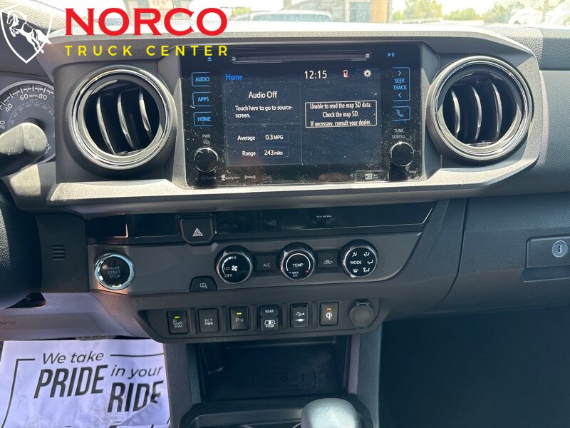 YOU ARE LOOKING AT A 2018 TOYOTA TACOMA WITH A CREW CAB BODY. THIS VEHICLE HAS AN AUTOMATIC TRANSMISSION, V6, 3.5L ENGINE WITH 51325 MILES. THE DRIVETRAIN IS: RWD. PLEASE CALL NORCO TRUCK CENTER INC FOR MORE INFORMATION AT (951) 372-0354 OR COME SEE US AT ~ 2075 HAMNER AVE. NORCO, CA. 92860 ~ -- INSTALLED FEATURES: Air filtration, Front air conditioning, Front air conditioning zones: single, Airbag deactivation: occupant sensing passenger, Front airbags: dual, Knee airbags: dual front, Side airbags: front, Side curtain airbags: front / rear, Side-curtain airbag rollover sensor, Antenna type: diversity / mast, Auxiliary audio input: Bluetooth / USB / iPod/iPhone / jack, In-Dash CD: single disc, Radio: AM/FM / touch screen display / voice operated, Radio data system, Satellite radio: SiriusXM, Speed sensitive volume control, Total speakers: 6, ABS: 4-wheel, Braking assist, Electronic brakeforce distribution, Front brake diameter: 10.8, Front brake type: ventilated disc, Power brakes, Rear brake diameter: 10.0, Rear brake type: drum, Floor material: carpet, Shift knob trim: urethane, Steering wheel trim: leather, Adaptive cruise control, Assist handle: front / rear, Center console: front console with armrest and storage, Cupholders: front / rear, Multi-function remote: keyless entry / panic alarm, One-touch windows: 1, Overhead console: front, Power outlet(s): 12V front, Power steering: variable/speed-proportional, Power windows: lockout button, Reading lights: front / rear, Rearview mirror: auto-dimming, Retained accessory power, Steering wheel: tilt and telescopic, Steering wheel mounted controls: audio / cruise control / multi-function / phone / voice control, Storage: door pockets / front seatback / grocery bag holder / sunglasses holder / under rear seats, Sun visors, Axle ratio: 3.91, Alternator: 130 amps, Auxiliary oil cooler, Battery saver, Spark plugs: iridium tipped, Bumper detail: rear step, Door handle color: body-color, Exhaust tip color: stainless-steel, Fender lip moldings: body-color, Front bumper color: body-color, Grille color: black / chrome surround, Mirror color: body-color, Pickup bed light, Rear bumper color: chrome, Skid plate(s): front, Tailgate: removable, Tailgate protection cap, Window trim: black, Connected in-car apps: weather, Infotainment: Entune, Infotainment screen size: 6.1 in., Clock, Compass, Digital odometer, Driver information system, External temperature display, Fuel economy display: MPG / range, Gauge: tachometer, Instrument cluster screen size: 4.2 in., Multi-function display, Trip odometer, Warnings and reminders: coolant temperature warning / lamp failure / low fuel level / low oil pressure / maintenance due / tire fill alert, Daytime running lights, Front fog lights, Headlights: auto delay off / auto high beam dimmer / halogen, Side mirror adjustments: manual folding / power, Active head restraints: dual front, Automatic emergency braking: front / front pedestrian, Body side reinforcements: side impact door beams, Camera system: rearview, Child safety door locks, Child seat anchors: LATCH system, Impact sensor: fuel cut-off, Lane deviation sensors, Pre-collision warning system: audible warning / pedestrian detection / visual warning, Rearview monitor: in dash, Safety brake pedal system, Emergency locking retractors: front / rear, Front seatbelts: 3-point, Rear seatbelts: 3-point, Seatbelt force limiters: front, Seatbelt pretensioners: front, Seatbelt warning sensor: front, Driver seat manual adjustments: lumbar / reclining / 4, Front headrests: adjustable / 2, Front seat type: bucket, Passenger seat manual adjustments: reclining / 4, Rear headrests: adjustable / foldable / 3, Rear seat folding: split, Rear seat type: 60-40 split bench, Upholstery: cloth, 2-stage unlocking doors, Anti-theft system: engine immobilizer, Power door locks: auto-locking, Hill holder control, Stability control, Traction control, Trailer stability control, Steering ratio: 17.4, Turns lock-to-lock: 3.40, Front shock type: gas, Front spring type: coil, Front stabilizer bar: diameter 30 mm, Front struts, Front suspension classification: independent, Front suspension type: double wishbone, Rear shock type: gas, Rear spring type: leaf, Rear stabilizer bar, Rear suspension classification: solid live axle, Rear suspension type: multi-leaf, Electronic messaging assistance: voice operated / with read function, Navigation app: Scout GPS Link, Navigation data: real time traffic, Phone: hands free, Wireless data link: Bluetooth, Spare tire mount location: underbody, Spare tire size: full-size, Spare wheel type: steel, Tire Pressure Monitoring System, Tire type: all season, Wheels: alloy, Auxiliary transmission fluid cooler, Cargo tie downs, Trailer hitch: Class IV, Trailer wiring: 4-pin / 7-pin, Front wipers: variable intermittent, Pickup sliding rear window: power horizontal, Power windows, Rear privacy glass
