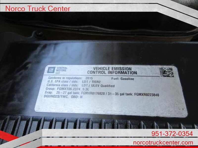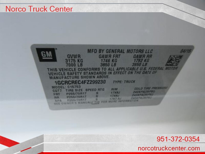 YOU ARE LOOKING AT A 2015 CHEVROLET SILVERADO C1500 WITH A 4 DOOR CAB; EXTENDED BODY. THIS VEHICLE HAS AN TRANSMISSION, V8, 5.3L; FFV; VVT ENGINE WITH 66373 MILES. THE DRIVETRAIN IS: RWD. PLEASE CALL NORCO TRUCK CENTER INC FOR MORE INFORMATION AT (951) 372-0354 OR COME SEE US AT ~ 2075 HAMNER AVE. NORCO, CA. 92860 ~ -- INSTALLED FEATURES: Front air conditioning, Front air conditioning zones: single, Airbag deactivation: occupant sensing passenger, Front airbags: dual, Side airbags: front, Side curtain airbags: front / rear, Side-curtain airbag rollover sensor, Antenna type: diversity / mast, Auxiliary audio input: Bluetooth / USB / jack / memory card slot, In-Dash CD: MP3 Playback / single disc, Internet radio app: Pandora, Radio: AM/FM / voice operated, Satellite radio: SiriusXM, Total speakers: 6, ABS: 4-wheel, Electronic brakeforce distribution, Front brake diameter: 13.0, Front brake type: ventilated disc, Front brake width: 1.18, Power brakes, Rear brake diameter: 13.6, Rear brake type: ventilated disc, Rear brake width: 0.79, Armrests: front center, Floor mat material: rubber/vinyl, Floor material: carpet, Floor mats: front / rear, Steering wheel trim: leather, Assist handle: front / passenger side / rear, Cruise control, Multi-function remote: keyless entry / panic alarm, One-touch windows: 4, Power steering, Power windows: lockout button, Rearview mirror: manual day/night, Retained accessory power, Steering wheel: tilt, Steering wheel mounted controls: audio / cruise control, Storage: front seatback / in seat cushion, Vanity mirrors: dual illuminating, Axle ratio: 3.23, Alternator: 150 amps, Auxiliary engine cooler, Auxiliary oil cooler, Battery: maintenance-free, Battery rating: 730 CCA, Battery saver, Body side moldings: body-color, Bumper detail: rear step, Door handle color: body-color, Exhaust tip color: stainless-steel, Front bumper color: chrome, Grille color: chrome / chrome surround, Mirror color: body-color, Pickup bed light, Pickup bed type: fleetside, Rear bumper color: chrome, Tailgate: lift assist, Tailgate protection cap, Window trim: black, Infotainment: MyLink, Clock, Driver information system, Gauge: oil pressure / tachometer, Trip odometer, Warnings and reminders: low fuel level / tire fill alert / turn off headlights, Daytime running lights, Headlights: auto on/off / halogen, Side mirror adjustments: power, Side mirror type: spotter mirror, Side mirrors: heated, Child safety door locks, Child seat anchors: LATCH system, Front seatbelts: 3-point, Rear seatbelts: 3-point, Seatbelt warning sensor: front, Driver seat manual adjustments: height / lumbar / reclining, Front headrests: adjustable / 2, Front seat type: 40-20-40 split bench, Passenger seat manual adjustments: reclining, Rear headrests: adjustable / 2, Rear seat folding: folds up, Rear seat type: 60-40 split bench, Upholstery: cloth, Power door locks, Hill holder control, Roll stability control, Stability control, Traction control, Trailer stability control, Front shock type: twin-tube gas, Front spring type: coil, Front stabilizer bar: diameter 34 mm, Front struts, Front suspension classification: independent, Front suspension type: upper and lower control arms, Rear shock type: twin-tube gas, Rear spring type: leaf, Rear suspension classification: solid live axle, Rear suspension type: multi-leaf, Phone: voice operated, Satellite communications: OnStar, Wifi: hotspot compatible, Wireless data link: Bluetooth, Spare tire mount location: underbody, Spare tire size: full-size, Spare wheel type: steel, Tire Pressure Monitoring System, Tire type: all season, Wheels: aluminum, Front wipers: variable intermittent, Power windows, Tinted glass