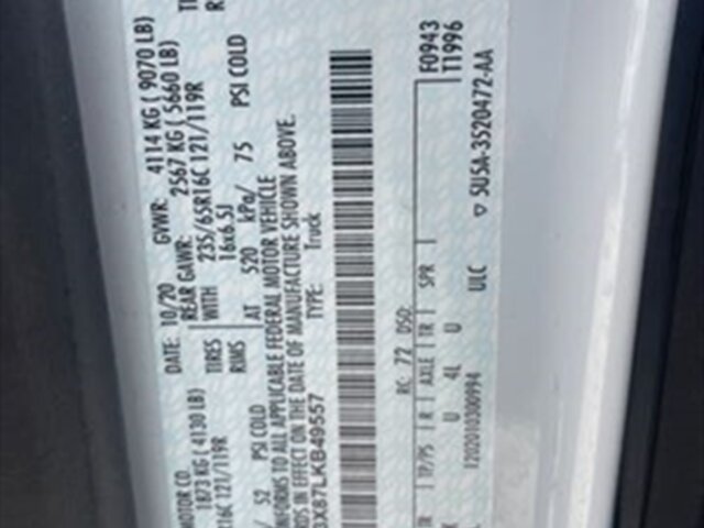 INSTALLED FEATURES: Front air conditioning, Front air conditioning zones: single, Airbag deactivation: passenger switch, Front airbags: dual, Side airbags: front, Side curtain airbags: front, Antenna type: mast, Auxiliary audio input: Bluetooth / USB, Radio: AM/FM, Total speakers: 4, ABS: 4-wheel, Braking assist, Cornering brake control, Electronic brakeforce distribution, Emergency braking preparation, Front brake diameter: 12.1, Front brake type: ventilated disc, Power brakes, Rear brake diameter: 12.1, Rear brake type: ventilated disc, Armrests: dual front, Floor material: rubber/vinyl, Shift knob trim: urethane, Steering wheel trim: urethane, Assist handle: front / rear, Capless fuel filler system, Cargo area light, Center console: front console with storage, Cupholders: front, Multi-function remote: keyless entry / panic alarm / trunk release, Overhead console: front, Power outlet(s): 12V front, Power steering: variable/speed-proportional, Reading lights: front, Steering wheel: tilt and telescopic, Steering wheel mounted controls: audio / multi-function / phone, Storage: cargo tie-down anchors and hooks / door pockets, Sun visors, Axle ratio: 4.10, Alternator: 250 amps, Battery: maintenance-free, Battery rating: 610 CCA, Body side moldings: black, Door handle color: black, Front bumper color: black, Grille color: black / black surround, Mirror color: black, Rear bumper color: black, Rear trunk/liftgate: barn, Side door type: passenger-side manual sliding, Window trim: black, Infotainment screen size: 4 in., Clock, Digital odometer, Gauge: tachometer, Trip odometer, Warnings and reminders: low fuel level, Headlights: auto high beam dimmer / halogen / wiper activated, Side mirror adjustments: manual folding / power, OEM roof height: high, Automatic emergency braking: front, Camera system: rearview, Driver attention alert system, Impact sensor: door unlock / post-collision safety system, Lane deviation sensors, Pre-collision warning system: audible warning / visual warning, Rearview monitor: in dash, Front seatbelts: 3-point, Driver seat manual adjustments: reclining / 2, Front headrests: adjustable / 2, Front seat type: bucket, Passenger seat manual adjustments: reclining / 2, Upholstery: vinyl, Anti-theft system: vehicle immobilizer, Power door locks: auto-locking, Crosswind stabilization, Hill holder control, Roll stability control, Stability control, Traction control, Trailer stability control, Front shock type: gas, Front spring type: coil, Front stabilizer bar, Front struts: MacPherson, Front suspension classification: independent, Front suspension type: lower control arms, Rear shock type: gas, Rear spring type: leaf, Rear suspension classification: solid live axle, Rear suspension type: multi-leaf, Smart device app compatibility: FordPass Connect, Smart device app function: engine start / lock operation / maintenance status / vehicle location, Wi-Fi: hotspot, Wireless data link: Bluetooth, Spare tire mount location: underbody, Spare tire size: full-size, Spare wheel type: steel, Tire Pressure Monitoring System, Tire type: all season, Wheel covers: partial, Wheels: painted steel, Auxiliary transmission fluid cooler, Front wipers: rain sensing / variable intermittent, Power windows, Solar-tinted glass