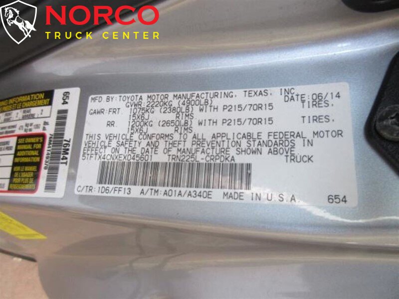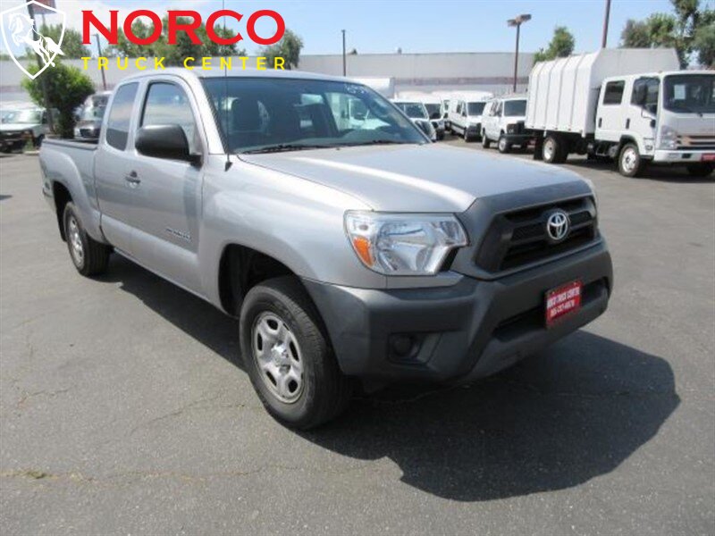 <ul><li><P style= "BORDER-TOP-COLOR: ; BORDER-LEFT-COLOR: ; BORDER-BOTTOM-COLOR: ; BORDER-RIGHT-COLOR: " >YOU ARE LOOKING AT A 2014 TOYOTA TACOMA WITH A EXTENDED CAB BODY. THIS VEHICLE HAS AN AUTOMATIC TRANSMISSION, L4, 2.7L ENGINE WITH 96720 MILES. THE DRIVETRAIN IS: RWD. PLEASE CALL NORCO TRUCK CENTER INC FOR MORE INFORMATION AT (951) 372-0354 OR COME SEE US AT ~ 2075 HAMNER AVE. NORCO, CA. 92860 ~ </P > <P style= "BORDER-TOP-COLOR: ; BORDER-LEFT-COLOR: ; BORDER-BOTTOM-COLOR: ; BORDER-RIGHT-COLOR: " > </P ></li></ul> -- INSTALLED FEATURES: Air filtration, Front air conditioning, Front air conditioning zones: single, Airbag deactivation: occupant sensing passenger / passenger switch, Front airbags: dual, Side airbags: front, Side curtain airbags: front / rear, Side-curtain airbag rollover sensor, Antenna type: element, Auxiliary audio input: Bluetooth / USB / iPod/iPhone / jack, In-Dash CD: MP3 Playback / single disc, Radio: AM/FM / touch screen display, Total speakers: 6, ABS: 4-wheel, Braking assist, Electronic brakeforce distribution, Front brake diameter: 10.8, Front brake type: ventilated disc, Power brakes, Rear brake diameter: 10.0, Rear brake type: drum, Floor material: carpet, Assist handle: front / rear, Center console: front console with armrest and storage, Cupholders: front / rear / 2, Overhead console: front, Power outlet(s): two 12V, Power steering: variable/speed-proportional, Reading lights: front / rear, Steering wheel: tilt and telescopic, Steering wheel mounted controls: audio / phone / voice control, Storage: door pockets / sunglasses holder / under rear seats, Vanity mirrors: passenger, Side door type: dual rear-hinged access, Axle ratio: 3.31, Door handle color: black, Front bumper color: black, Grille color: black, Mirror color: black, Mudguards: rear, Rear bumper color: black, Tailgate: removable, Window trim: black, Infotainment screen size: 6.1 in., Clock, Digital odometer, Gauge: tachometer, Trip odometer, Warnings and reminders: coolant temperature warning / lamp failure / low fuel level / low oil pressure / tire fill alert, Daytime running lights, Headlights: auto delay off / halogen, Side mirror adjustments: manual folding, Active head restraints: dual front, Body side reinforcements: side impact door beams, Child seat anchors: LATCH system, Emergency locking retractors: front / rear, Front seatbelts: 3-point, Rear seatbelts: 3-point, Seatbelt force limiters: front, Seatbelt pretensioners: front, Driver seat manual adjustments: 4, Front headrests: adjustable / 2, Front seat type: bucket, Passenger seat folding: folds flat, Passenger seat manual adjustments: 4, Rear headrests: adjustable / 2, Rear seat folding: folds up, Rear seat type: jumpseats, Upholstery: cloth, Power door locks, Stability control, Traction control, Steering ratio: 17.4, Turns lock-to-lock: 3.40, Front shock type: gas, Front spring type: coil, Front stabilizer bar: diameter 30 mm, Front struts, Front suspension classification: independent, Front suspension type: double wishbone, Rear shock type: gas, Rear spring type: leaf, Rear suspension classification: solid live axle, Rear suspension type: multi-leaf, Phone: hands free, Wireless data link: Bluetooth, Spare tire mount location: underbody, Spare tire size: full-size, Tire Pressure Monitoring System, Tire type: all season, Wheels: steel, Cargo tie downs, Front wipers: intermittent, Power windows