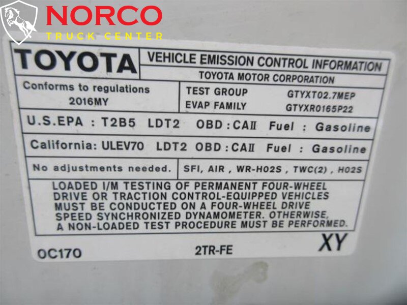 <ul><li><P style= "BORDER-TOP-COLOR: ; BORDER-LEFT-COLOR: ; BORDER-BOTTOM-COLOR: ; BORDER-RIGHT-COLOR: " >YOU ARE LOOKING AT A 2016 TOYOTA TACOMA WITH A 4 DOOR CAB; ACCESS CAB; LONG WHEELBASE BODY. THIS VEHICLE HAS AN AUTMATIC TRANSMISSION, L4, 2.7L ENGINE WITH 74267 MILES. THE DRIVETRAIN IS: RWD. PLEASE CALL NORCO TRUCK CENTER INC FOR MORE INFORMATION AT (951) 372-0354 OR COME SEE US AT ~ 2075 HAMNER AVE. NORCO, CA. 92860 ~ </P > <P style= "BORDER-TOP-COLOR: ; BORDER-LEFT-COLOR: ; BORDER-BOTTOM-COLOR: ; BORDER-RIGHT-COLOR: " > </P ></li></ul> -- INSTALLED FEATURES: Air filtration, Front air conditioning, Front air conditioning zones: single, Airbag deactivation: passenger switch, Front airbags: dual, Knee airbags: dual front, Side airbags: front, Side curtain airbags: front / rear, Side-curtain airbag rollover sensor, Antenna type: mast, Auxiliary audio input: Bluetooth / USB / iPod/iPhone / jack, In-Dash CD: MP3 Playback / single disc, Radio: AM/FM / touch screen display / voice operated, Total speakers: 6, ABS: 4-wheel, Braking assist, Electronic brakeforce distribution, Front brake diameter: 10.8, Front brake type: ventilated disc, Power brakes, Rear brake diameter: 10.0, Rear brake type: drum, Floor material: carpet, Steering wheel trim: urethane, Assist handle: front / rear, Center console: front console with armrest and storage, Cupholders: front, One-touch windows: 1, Overhead console: front, Power outlet(s): 12V front, Power steering: variable/speed-proportional, Power windows: lockout button, Reading lights: front / rear, Rearview mirror: manual day/night, Retained accessory power, Steering wheel: tilt and telescopic, Steering wheel mounted controls: audio / voice control, Storage: door pockets / sunglasses holder / under rear seats, Vanity mirrors: passenger, Side door type: dual rear-hinged access, Axle ratio: 4.30, Battery saver, Spark plugs: iridium tipped, Door handle color: body-color, Front bumper color: black, Grille color: black surround / silver, Mirror color: body-color, Rear bumper color: body-color, Skid plate(s): front, Tailgate: removable, Tailgate protection cap, Window trim: black, Infotainment: Entune, Infotainment screen size: 6.1 in., Clock, Digital odometer, Gauge: tachometer, Instrument cluster screen size: 2.2 in., Multi-function display, Trip odometer, Warnings and reminders: coolant temperature warning / lamp failure / low fuel level / low oil pressure / tire fill alert, Daytime running lights, Headlights: auto delay off / halogen, Side mirror adjustments: manual folding / power, Active head restraints: dual front, Body side reinforcements: side impact door beams, Camera system: rearview, Child seat anchors: LATCH system, Rearview monitor: in dash, Safety brake pedal system, Emergency locking retractors: front / rear, Front seatbelts: 3-point, Rear seatbelts: 3-point, Seatbelt force limiters: front, Seatbelt pretensioners: front, Seatbelt warning sensor: front, Driver seat manual adjustments: lumbar / reclining / 4, Front headrests: adjustable / 2, Front seat type: bucket, Passenger seat folding: folds flat, Passenger seat manual adjustments: reclining / 4, Rear headrests: 2, Rear seat folding: folds up, Rear seat type: jumpseats, Upholstery: cloth, Anti-theft system: engine immobilizer, Power door locks: auto-locking, Hill holder control, Stability control, Traction control, Steering ratio: 17.4, Turns lock-to-lock: 3.40, Front shock type: gas, Front spring type: coil, Front stabilizer bar: diameter 30 mm, Front struts, Front suspension classification: independent, Front suspension type: double wishbone, Rear shock type: gas, Rear spring type: leaf, Rear suspension classification: solid live axle, Rear suspension type: multi-leaf, Electronic messaging assistance: voice operated / with read function, Phone: hands free, Wireless data link: Bluetooth, Spare tire mount location: underbody, Spare tire size: full-size, Spare wheel type: steel, Tire Pressure Monitoring System, Tire type: all season, Wheels: steel, Cargo tie downs, Front wipers: intermittent, Pickup sliding rear window: manual, Power windows