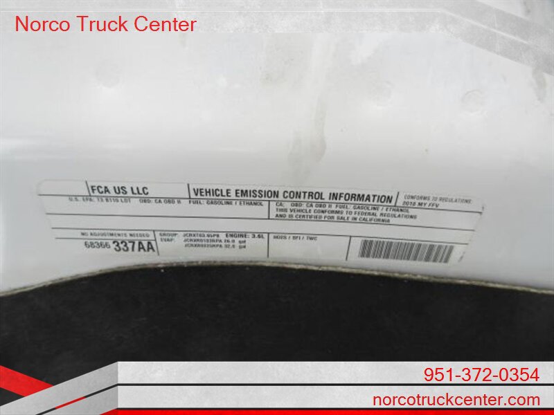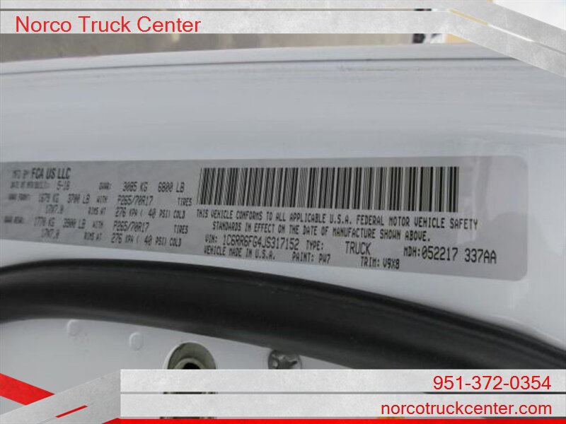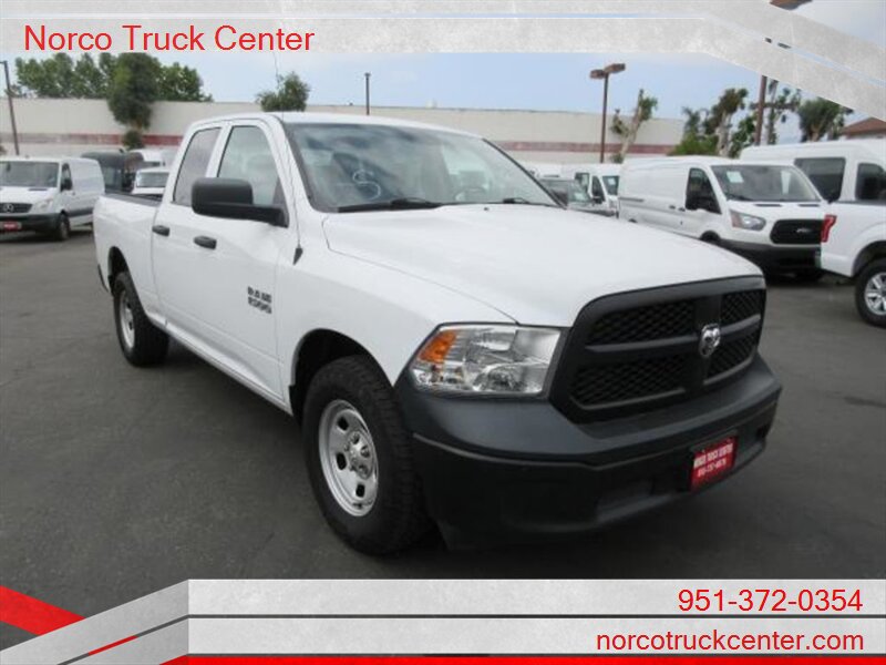 YOU ARE LOOKING AT A 2018 RAM 1500 WITH A QUAD CAB BODY. THIS VEHICLE HAS AN AT TRANSMISSION, V6, 3.6L; FFV; DOHC ENGINE WITH 78296 MILES. THE DRIVETRAIN IS: RWD. PLEASE CALL NORCO TRUCK CENTER INC FOR MORE INFORMATION AT (951) 372-0354 OR COME SEE US AT ~ 2075 HAMNER AVE. NORCO, CA. 92860 ~ -- INSTALLED FEATURES: Front air conditioning, Front air conditioning zones: single, Airbag deactivation: occupant sensing passenger, Front airbags: dual, Side airbags: front, Side curtain airbags: front / rear, Antenna type: mast, Auxiliary audio input: USB / jack, Radio: AM/FM, Speed sensitive volume control, Total speakers: 6, ABS: 4-wheel, Brake drying, Braking assist, Electronic brakeforce distribution, Front brake diameter: 13.2, Front brake type: ventilated disc, Front brake width: 1.1, Power brakes, Rear brake diameter: 13.8, Rear brake type: ventilated disc, Rear brake width: 0.87, Armrests: front center, Dash trim: simulated alloy, Floor material: rubber/vinyl, Steering wheel trim: urethane, Assist handle: front / rear, Cruise control, Cupholders: front / rear, One-touch windows: 2, Power outlet(s): 12V front, Power steering, Power windows: lockout button, Rearview mirror: manual day/night, Retained accessory power, Steering wheel: tilt, Steering wheel mounted controls: cruise control / multi-function, Storage: door pockets / under rear seats, Sun visors, Axle ratio: 3.21, Alternator: 160 amps, Auxiliary oil cooler, Battery: maintenance-free, Battery rating: 730 CCA, Battery saver, Emissions: 50 state, Active grille shutters, Door handle color: black, Front bumper color: black, Grille color: black / black surround, License plate bracket: front, Mirror color: black, Pickup bed light, Pickup bed liner: spray-on, Rear bumper color: black, Tailgate: removable, Window trim: black, Infotainment screen size: 3 in., Clock, Digital odometer, Engine hour meter, External temperature display, Fuel economy display: MPG / range, Gauge: tachometer, Instrument cluster screen size: 3.5 in., Multi-function display, Warnings and reminders: low fuel level / low oil level / maintenance due / tire fill alert, Headlights: auto delay off / auto on/off / halogen / quad headlights, Side mirror adjustments: manual folding / power, Side mirrors: heated, Body side reinforcements: side impact door beams, Camera system: rearview, Child safety door locks, Child seat anchors: LATCH system, Crumple zones: front, Energy absorbing steering column, Rearview monitor: in mirror, Emergency locking retractors: front / rear, Front seatbelts: 3-point, Rear seatbelts: 3-point, Seatbelt force limiters: front, Seatbelt pretensioners: front, Seatbelt warning sensor: front, Driver seat manual adjustments: reclining / 4, Front headrests: adjustable / 2, Front seat type: 40-20-40 split bench, Passenger seat manual adjustments: reclining / 4, Rear headrests: adjustable / 3, Rear seat folding: folds up, Rear seat type: bench, Upholstery: vinyl, 2-stage unlocking doors, Anti-theft system: engine immobilizer, Power door locks: anti-lockout / auto-locking, Rolling code security: key, Hill holder control, Roll stability control, Stability control, Traction control, Trailer stability control, Steering ratio: 17.9, Turns lock-to-lock: 3.3, Front shock type: twin-tube gas, Front spring type: coil, Front stabilizer bar, Front struts, Front suspension classification: independent, Front suspension type: short and long arm, Rear shock type: twin-tube gas, Rear spring type: coil, Rear stabilizer bar, Rear suspension classification: solid live axle, Rear suspension type: multi-link, Spare tire mount location: underbody, Spare tire size: full-size, Spare wheel type: steel, Tire Pressure Monitoring System, Tire type: all season, Wheels: steel, Auxiliary transmission fluid cooler, Trailer hitch: Class IV, Trailer wiring: 4-pin / 7-pin, Front wipers: variable intermittent, Power windows: safety reverse, Rear privacy glass, Solar-tinted glass