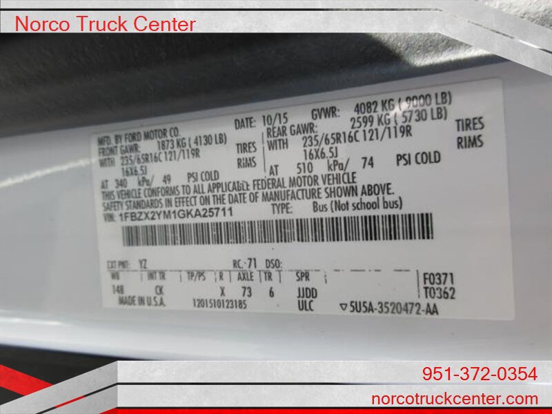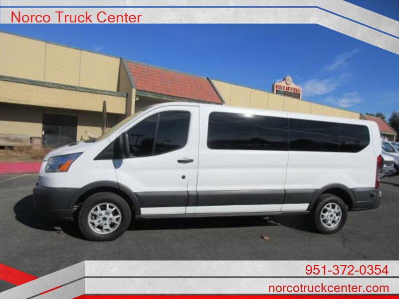 <ul><li><P style= "BORDER-TOP-COLOR: ; BORDER-LEFT-COLOR: ; BORDER-BOTTOM-COLOR: ; BORDER-RIGHT-COLOR: " >YOU ARE LOOKING AT A 2016 FORD TRANSIT T350 WITH A 4 DOOR VAN; 11 PASSENGER BODY. THIS VEHICLE HAS AN AUTMATIC TRANSMISSION, V6, 3.7L; FFV; DOHC 24V ENGINE WITH 131249 MILES. THE DRIVETRAIN IS: RWD. PLEASE CALL NORCO TRUCK CENTER INC FOR MORE INFORMATION AT (951) 372-0354 OR COME SEE US AT ~ 2075 HAMNER AVE. NORCO, CA. 92860 ~ </P > <P style= "BORDER-TOP-COLOR: ; BORDER-LEFT-COLOR: ; BORDER-BOTTOM-COLOR: ; BORDER-RIGHT-COLOR: " > </P ></li></ul> -- INSTALLED FEATURES: Front air conditioning, Front air conditioning zones: single, Rear air conditioning, Rear air conditioning zones: single, Front airbags: dual, Side airbags: front, Side curtain airbags: front / rear / third row, Side-curtain airbag rollover sensor, Antenna type: mast, Auxiliary audio input: jack, Radio: AM/FM, Total speakers: 6, ABS: 4-wheel, Braking assist, Electronic brakeforce distribution, Front brake diameter: 12.1, Front brake type: ventilated disc, Power brakes, Rear brake diameter: 12.1, Rear brake type: disc, Armrests: drivers seat, Floor material: rubber/vinyl, Shift knob trim: urethane, Steering wheel trim: urethane, Assist handle: passenger side, Capless fuel filler system, Cargo area light, Center console: front console with storage, Cupholders: front / rear, Multi-function remote: keyless entry, One-touch windows: 1, Power outlet(s): 12V cargo area / 12V front, Power steering, Reading lights: front, Rearview mirror: manual day/night, Retained accessory power, Steering wheel: tilt and telescopic, Storage: door pockets, Sun visors, Rear door type: barn, Side door type: passenger-side manual sliding, Axle ratio: 3.73, Alternator: 150 amps, Battery: maintenance-free, Body side moldings: black, Bumper detail: rear step, Door handle color: black, Front bumper color: black, Grille color: black / black surround, Headlight bezel color: black, Mirror color: black, Rear bumper color: black, Window trim: black, Clock, Digital odometer, Engine hour meter, Gauge: tachometer, Warnings and reminders: low fuel level / tire fill alert, Headlights: halogen, Side mirror adjustments: manual folding / power, OEM roof height: low, Camera system: rearview, Child safety door locks, Child seat anchors: LATCH system, Impact sensor: post-collision safety system, Rearview monitor: in mirror, Fourth row seatbelts: 3-point, Front seatbelts: 3-point, Rear seatbelts: 3-point, Seatbelt pretensioners: front, Seatbelt warning sensor: front, Third row seatbelts: 3-point, Driver seat manual adjustments: reclining / 4, Fourth row headrests: 4, Fourth row seat type: 50-50 split bench, Front headrests: adjustable / 2, Front seat type: bucket, Passenger seat manual adjustments: reclining / 4, Rear headrests: adjustable / 3, Rear seat folding: split, Rear seat type: 60-40 split bench, Third row headrests: adjustable / 3, Third row seat folding: split, Third row seat type: 40-60 split bench, Upholstery: vinyl, Power door locks: auto-locking, Hill holder control, Roll stability control, Stability control, Traction control, Front shock type: gas, Front spring type: coil, Front stabilizer bar, Front struts: MacPherson, Front suspension classification: independent, Front suspension type: lower control arms, Rear shock type: gas, Rear spring type: leaf, Rear suspension classification: solid live axle, Rear suspension type: multi-leaf, Spare tire mount location: underbody, Spare tire size: full-size, Spare wheel type: steel, Tire Pressure Monitoring System, Tire type: all season, Wheel covers: partial, Wheels: steel, Front wipers: variable intermittent, Power windows, Solar-tinted glass