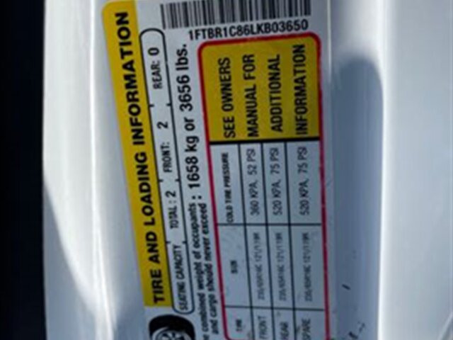 -- INSTALLED FEATURES: Front air conditioning, Front air conditioning zones: single, Airbag deactivation: passenger switch, Front airbags: dual, Side airbags: front, Side curtain airbags: front, Antenna type: mast, Auxiliary audio input: Bluetooth / USB, Radio: AM/FM, Total speakers: 4, ABS: 4-wheel, Braking assist, Cornering brake control, Electronic brakeforce distribution, Emergency braking preparation, Front brake diameter: 12.1, Front brake type: ventilated disc, Power brakes, Rear brake diameter: 12.1, Rear brake type: ventilated disc, Armrests: dual front, Floor material: rubber/vinyl, Shift knob trim: urethane, Steering wheel trim: urethane, Assist handle: front / rear, Capless fuel filler system, Cargo area light, Center console: front console with storage, Cupholders: front, Multi-function remote: keyless entry / panic alarm / trunk release, Overhead console: front, Power outlet(s): 12V front, Power steering: variable/speed-proportional, Reading lights: front, Steering wheel: tilt and telescopic, Steering wheel mounted controls: audio / multi-function / phone, Storage: cargo tie-down anchors and hooks / door pockets, Sun visors, Axle ratio: 3.73, Alternator: 250 amps, Battery: maintenance-free, Battery rating: 610 CCA, Body side moldings: black, Door handle color: black, Front bumper color: black, Grille color: black / black surround, Mirror color: black, Rear bumper color: black, Rear trunk/liftgate: barn, Side door type: passenger-side manual sliding, Window trim: black, Infotainment screen size: 4 in., Clock, Digital odometer, Gauge: tachometer, Trip odometer, Warnings and reminders: low fuel level, Headlights: auto high beam dimmer / halogen / wiper activated, Side mirror adjustments: manual folding / power, OEM roof height: medium, Automatic emergency braking: front, Camera system: rearview, Driver attention alert system, Impact sensor: door unlock / post-collision safety system, Lane deviation sensors, Pre-collision warning system: audible warning / visual warning, Rearview monitor: in dash, Front seatbelts: 3-point, Driver seat manual adjustments: reclining / 2, Front headrests: adjustable / 2, Front seat type: bucket, Passenger seat manual adjustments: reclining / 2, Upholstery: vinyl, Anti-theft system: vehicle immobilizer, Power door locks: auto-locking, Crosswind stabilization, Hill holder control, Roll stability control, Stability control, Traction control, Trailer stability control, Front shock type: gas, Front spring type: coil, Front stabilizer bar, Front struts: MacPherson, Front suspension classification: independent, Front suspension type: lower control arms, Rear shock type: gas, Rear spring type: leaf, Rear suspension classification: solid live axle, Rear suspension type: multi-leaf, Smart device app compatibility: FordPass Connect, Smart device app function: engine start / lock operation / maintenance status / vehicle location, Wi-Fi: hotspot, Wireless data link: Bluetooth, Spare tire mount location: underbody, Spare tire size: full-size, Spare wheel type: steel, Tire Pressure Monitoring System, Tire type: all season, Wheel covers: partial, Wheels: painted steel, Auxiliary transmission fluid cooler, Front wipers: rain sensing / variable intermittent, Power windows, Solar-tinted glass