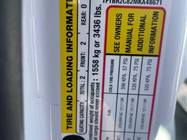 INSTALLED FEATURES: Front air conditioning, Front air conditioning zones: single, Airbag deactivation: passenger switch, Front airbags: dual, Side airbags: front, Side curtain airbags: front, Antenna type: mast, Auxiliary audio input: Bluetooth / USB, Radio: AM/FM, Total speakers: 4, ABS: 4-wheel, Braking assist, Cornering brake control, Electronic brakeforce distribution, Electronic parking brake: auto off, Emergency braking preparation, Front brake type: ventilated disc, Power brakes, Rear brake type: ventilated disc, Armrests: dual front, Floor material: rubber/vinyl, Shift knob trim: urethane, Steering wheel trim: urethane, Assist handle: front / rear, Capless fuel filler system, Cargo area light, Center console: front console with storage, Cupholders: front, Multi-function remote: keyless entry / panic alarm / trunk release, One-touch windows: 1, Power outlet(s): 12V front / USB front, Power steering: variable/speed-proportional, Reading lights: front, Steering wheel: tilt and telescopic, Steering wheel mounted controls: audio / multi-function / phone, Storage: door pockets, Sun visors, Body side moldings: black, Door handle color: black, Front bumper color: black, Grille color: black / black surround, Mirror color: black, Rear bumper color: black, Rear trunk/liftgate: barn, Side door type: passenger-side manual sliding, Window trim: black, Infotainment screen size: 4 in., Clock, Digital odometer, Gauge: tachometer, Trip odometer, Warnings and reminders: coolant temperature warning / low fuel level / low oil pressure, Headlights: auto delay off / auto high beam dimmer / auto on/off / halogen, Side mirror adjustments: manual folding / power, 4WD type: on demand, Alternator: 250 amps, Auxiliary transmission fluid cooler, Battery: maintenance-free, Battery rating: 610 CCA, Limited slip differential: rear, OEM roof height: medium, Automatic emergency braking: front / front pedestrian, Camera system: rearview, Driver attention alert system, Impact sensor: door unlock / post-collision safety system, Lane deviation sensors, Pre-collision warning system: audible warning / pedestrian detection / visual warning, Rearview monitor: in dash, Front seatbelts: 3-point, Seatbelt warning sensor: front, Driver seat manual adjustments: 2 / reclining, Front headrests: 2 / adjustable, Front seat type: bucket, Passenger seat manual adjustments: 2 / reclining, Upholstery: vinyl, Anti-theft system: vehicle immobilizer, Power door locks: auto-locking, Crosswind stabilization, Hill holder control, Roll stability control, Stability control, Traction control, Trailer stability control, Front shock type: gas, Front spring type: coil, Front stabilizer bar, Front struts: MacPherson, Front suspension classification: independent, Front suspension type: lower control arms, Rear shock type: gas, Rear spring type: leaf, Rear suspension classification: solid live axle, Rear suspension type: multi-leaf, Hands-free phone call integration, Smart device app compatibility: FordPass Connect, Smart device app function: engine start / lock operation / maintenance status / vehicle location, Wi-Fi: hotspot, Wireless data link: Bluetooth, Spare tire mount location: underbody, Spare tire size: full-size, Spare wheel type: steel, Tire Pressure Monitoring System, Wheel covers: partial, Wheels: painted steel, Front wipers: rain sensing / variable intermittent, Power windows: safety reverse, Solar-tinted glass