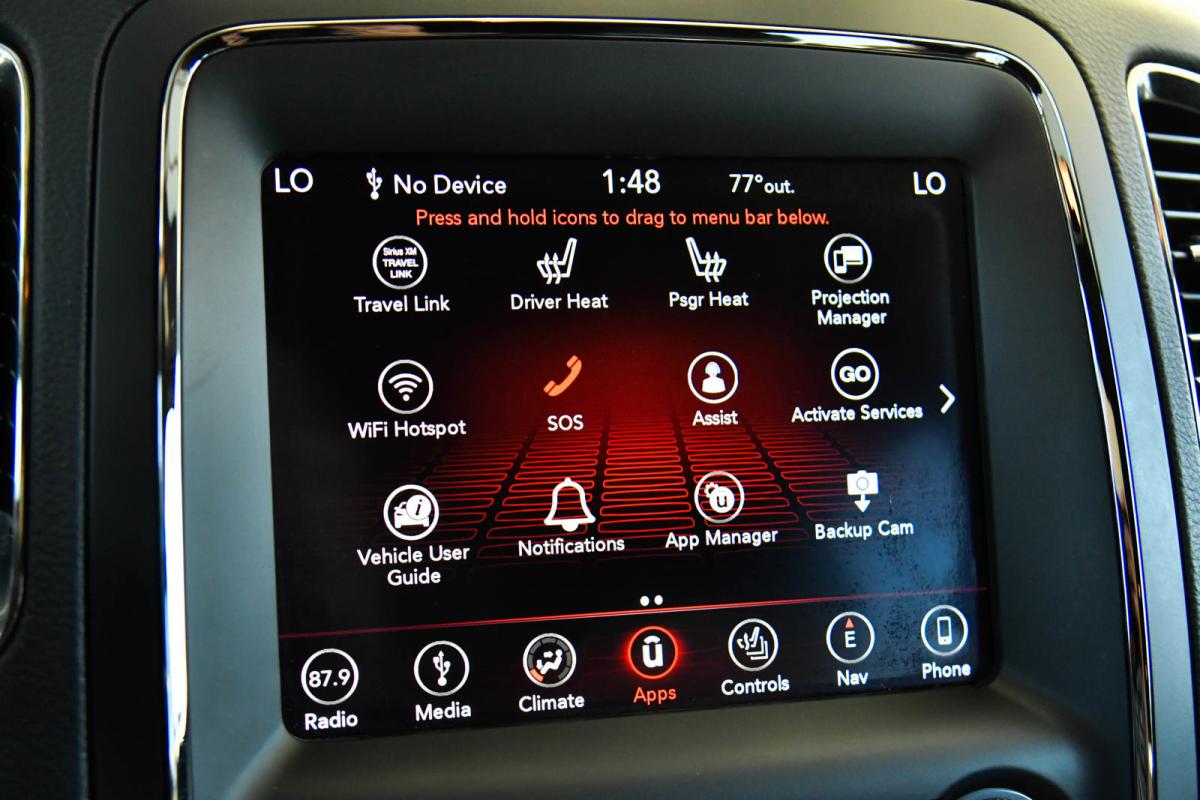 KBB.com Brand Image Awards. Scores 26 Highway MPG and 19 City MPG! This Dodge Durango boasts a Regular Unleaded V-6 3.6 L/220 engine powering this Automatic transmission. WHEELS: 20 X 8.0 BRASS MONKEY BRONZE, TRANSMISSION: 8-SPEED AUTOMATIC (850RE) (STD), TIRES: 265/50R20 BSW AS LRR (STD).*This Dodge Durango Comes Equipped with These Options *QUICK ORDER PACKAGE 2BE GT PLUS -inc: Engine: 3.6L V6 24V VVT UPG I w/ESS, Transmission: 8-Speed Automatic (850RE), Power 6x9 Multi-Function Foldaway Mirrors, Remote Start System, Heated Front Seats, Power 8-Way Driver Memory 6-Way Passenger Seats, Power Driver/Passenger 4-Way Lumbar Adjust, Exterior Mirrors w/Supplemental Signals, Bright Front Door Sill Scuff Pads, Bright Cargo Area Scuff Pads, Auto Dim Exterior Driver Mirror, Dual Remote USB Port - Charge Only, 115V Auxiliary Power Outlet, Universal Garage Door Opener, Exterior Mirrors w/Memory, Heated Second Row Seats, Heated Steering Wheel, Power Liftgate, Security Alarm, Sun Visors w/Illuminated Vanity Mirrors, Radio/Driver Seat/Mirrors Memory, BRASS MONKEY APPEARANCE PACKAGE -inc: Wheels: 20 x 8.0 Brass Monkey Bronze, Gloss Black Badges , RADIO: UCONNECT 4C NAV W/8.4 DISPLAY -inc: SiriusXM Traffic Plus, HD Radio, For Details Visit DriveUconnect.com, 1-YR SiriusXM Guardian Trial, 5-Year SiriusXM Travel Link Service, 5-Year SiriusXM Traffic Service, GPS Navigation, SiriusXM Travel Link, 4G LTE Wi-Fi Hot Spot, 8.4 Touchscreen Display, PREMIUM GROUP -inc: Power Sunroof, 506 Watt Amplifier, 9 Alpine Amplified Speakers w/Subwoofer, Radio: Uconnect 4C Nav w/8.4 Display, SiriusXM Traffic Plus, HD Radio, For Details Visit DriveUconnect.com, 1-Yr SiriusXM Guardian Trial, 5-Year SiriusXM Travel Link Service, 5-Year SiriusXM Traffic Service, GPS Navigation, SiriusXM Travel Link, 4G LTE Wi-Fi Hot Spot, 8.4 Touchscreen Display, Integrated Roof Rail Crossbars, Black Roof Rails, POWER SUNROOF, MANUFACTURER'S STATEMENT OF ORIGIN, FRONT LICENSE PLATE BRACKET, ENGINE: 3.6L V6 24V VVT UPG I W/ESS (STD), DB BLACK CLEARCOAT, BLACK, LEATHER SUEDE BUCKET SEATS.