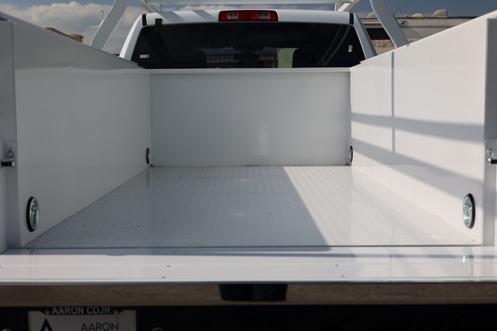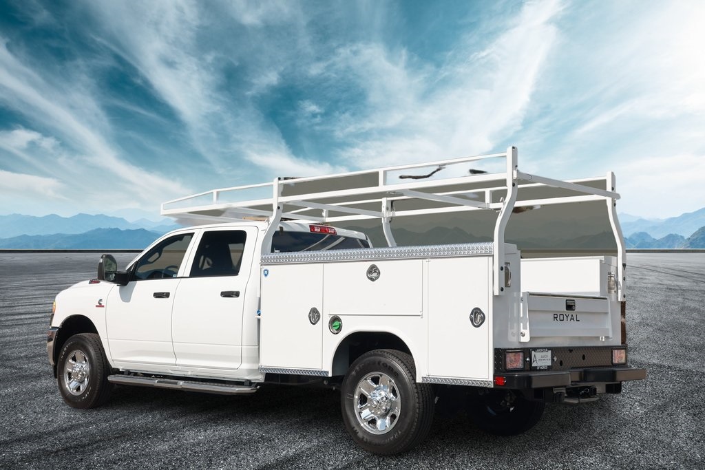 8ft Royal Service Body w/ Open Top Lid - Internal Master Lock, Aluminum Treadbright Pop Top Lids, Tapered Over Cab Rack w/ Hooks and Forklift Ready Swing Away Cross bars, 8" Recessed Diamond Plate Step Bumper, 2.5" Class V Tube Receiver w/ 2" Sleeve, Backup Camera Price includes: $1000 - 2024 RAM Commercial Truck Season Bonus Cash 39CR2. Exp. 01/02/2024 $2000 - 2024 RAM Bonus Cash 24CRA. Exp. 01/02/2024