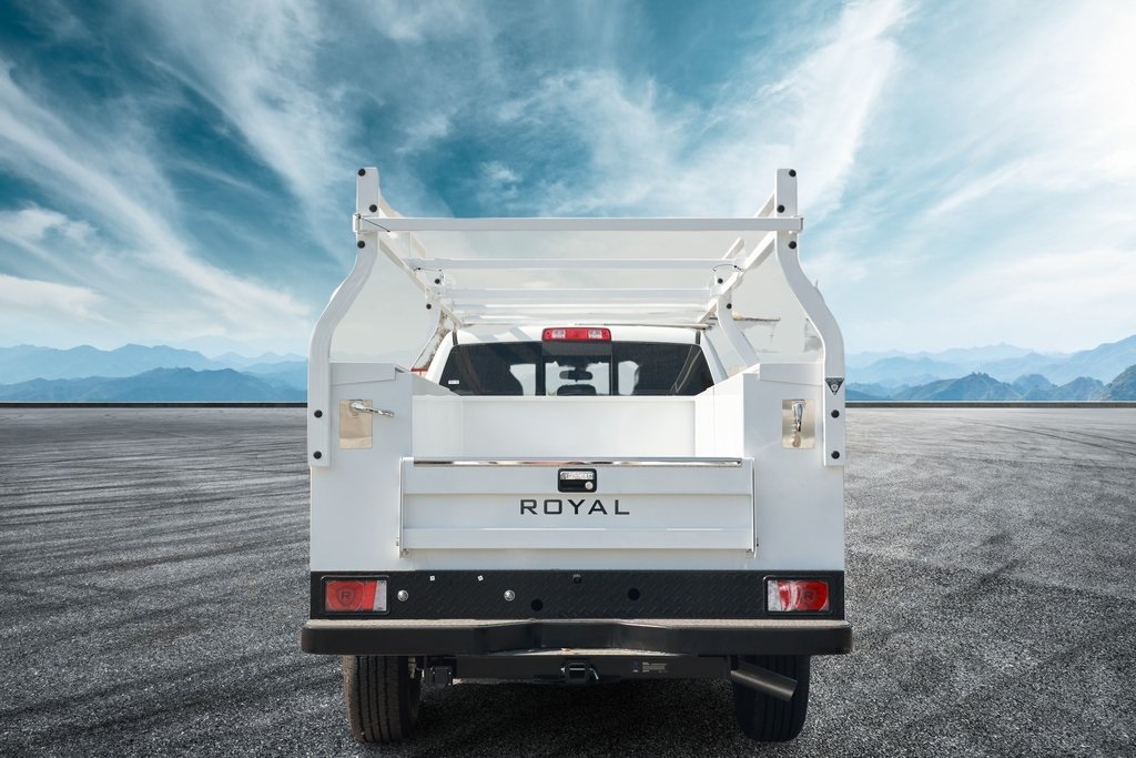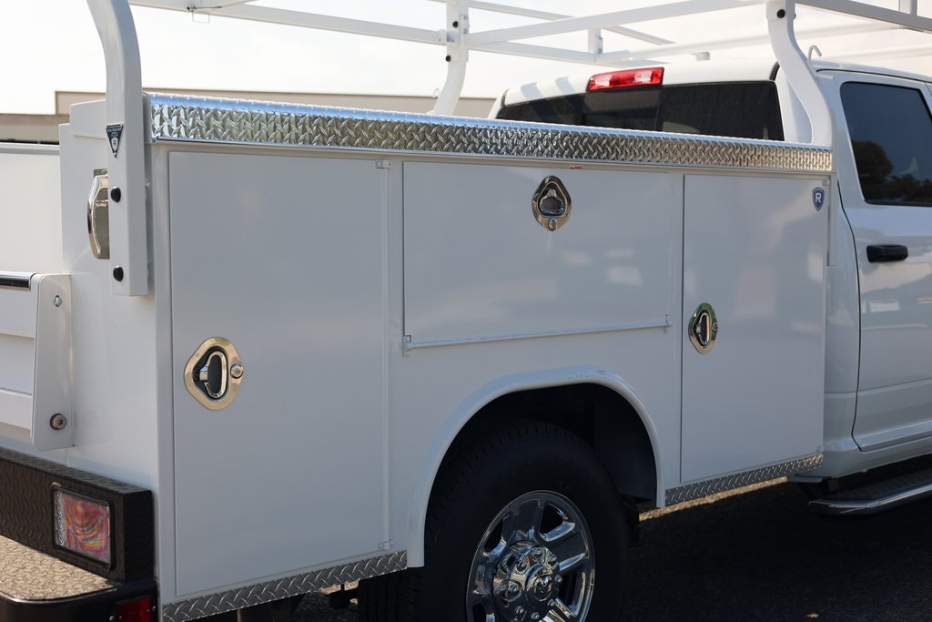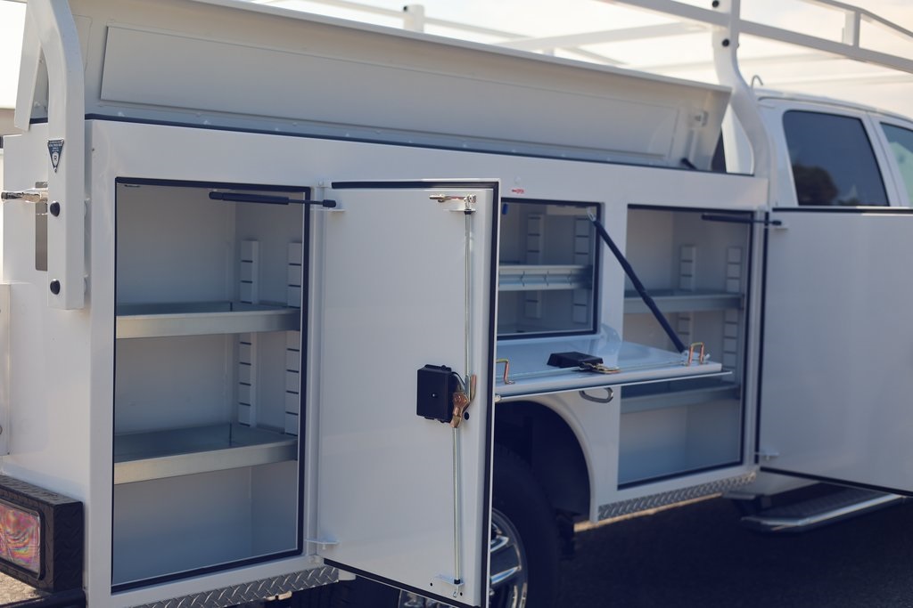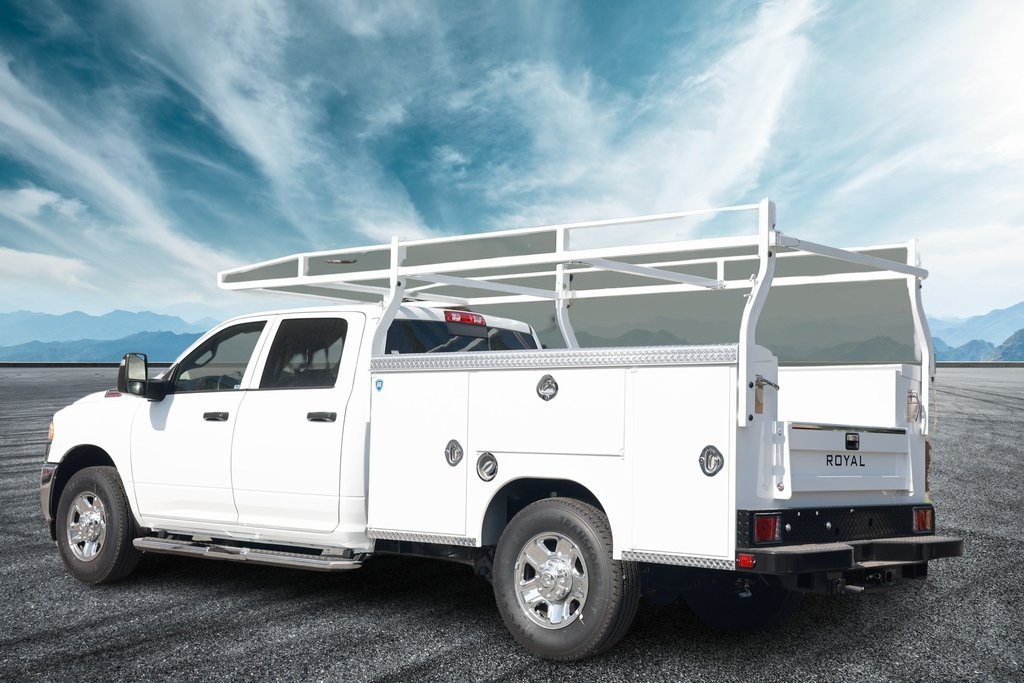 8ft Scelzi Service Body - Treadbright Pop Top Lids, Tapered Leg Ladder Rack w/ Hooks and Forklift Ready Swing Away Cross bars, 6" Diamond Plate Step Bumper, 2.5" Class V Tube Receiver w/ 2" Sleeve, Backup Camera