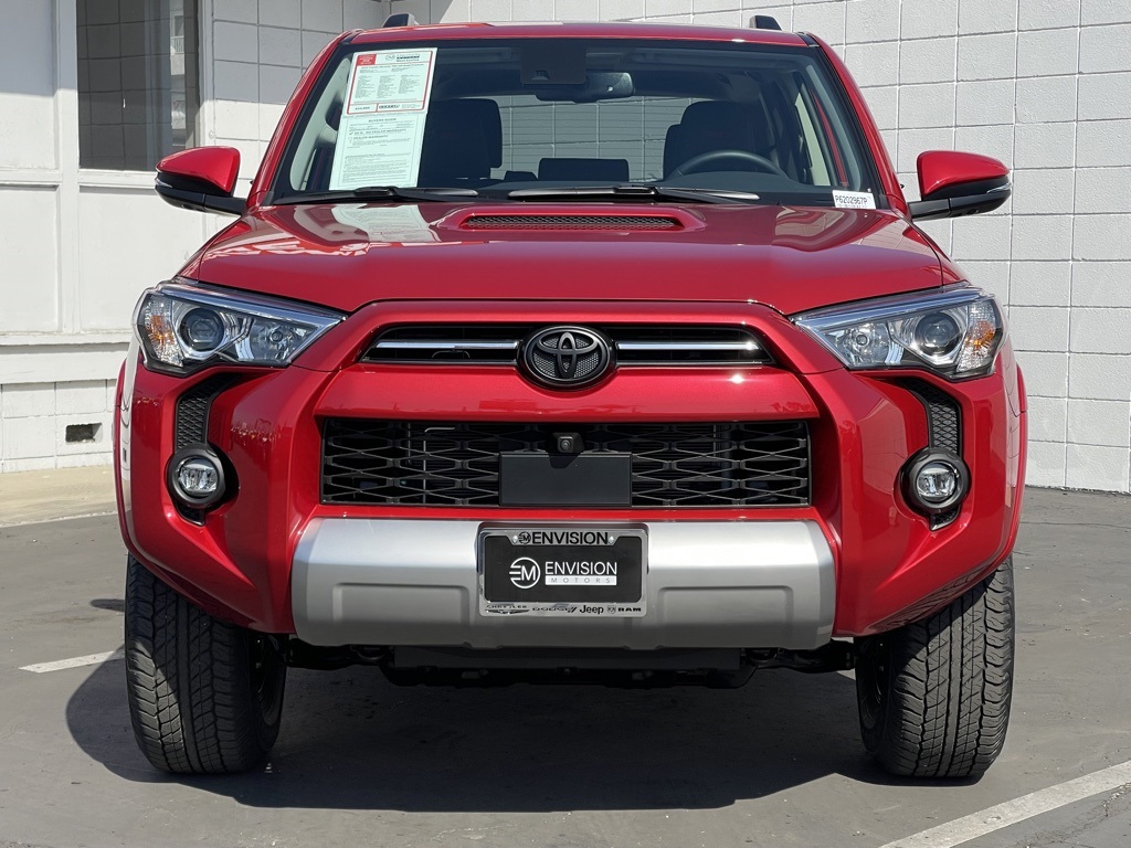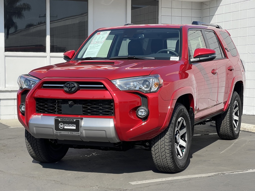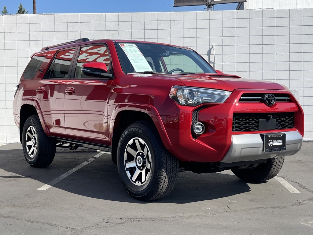 CARFAX One-Owner. Clean CARFAX.Odometer is 6104 miles below market average! 4WD, Black/Graphite w/SofTex Seat Trim, Black Roof Rails, Heated Outside Rear-View Mirrors, Moonroof w/Tilt Up & Slide, Navigation System, Off Road Package.Barcelona Red2023 Toyota 4Runner TRD Off-Road Premium 4WD 5-Speed with ECT 4.0L V6 DOHC 24V**********All Pricing and Advertised Prices for any/all vehicles offered for sale does not include dealer installed accessories which can be purchased for an additional cost.********** The Factory Rebates may not be available on this vehicle if you elect to take advantage of a Special Alternative APR or Special Lease program. Some Factory Rebates are California Resident specific and may vary for residents of other states. NO sales to Dealers, Brokers or Exporters. For out of state purchase, customers must be present to purchase. If shipping is required, dealership must facilitate; no exceptions. Please contact us for special Multi-Vehicle or Fleet pricing. Prices are plus government fees and taxes, any finance charges, $85 documentary fee, $29 electronic registration fee, any emission testing charge and $1.75 per new tire state tire fee. *** We make every effort to provide accurate information, but please verify before purchasing. Leasing & financing available on approved credit. Trade-ins accepted. Subject to prior sale.