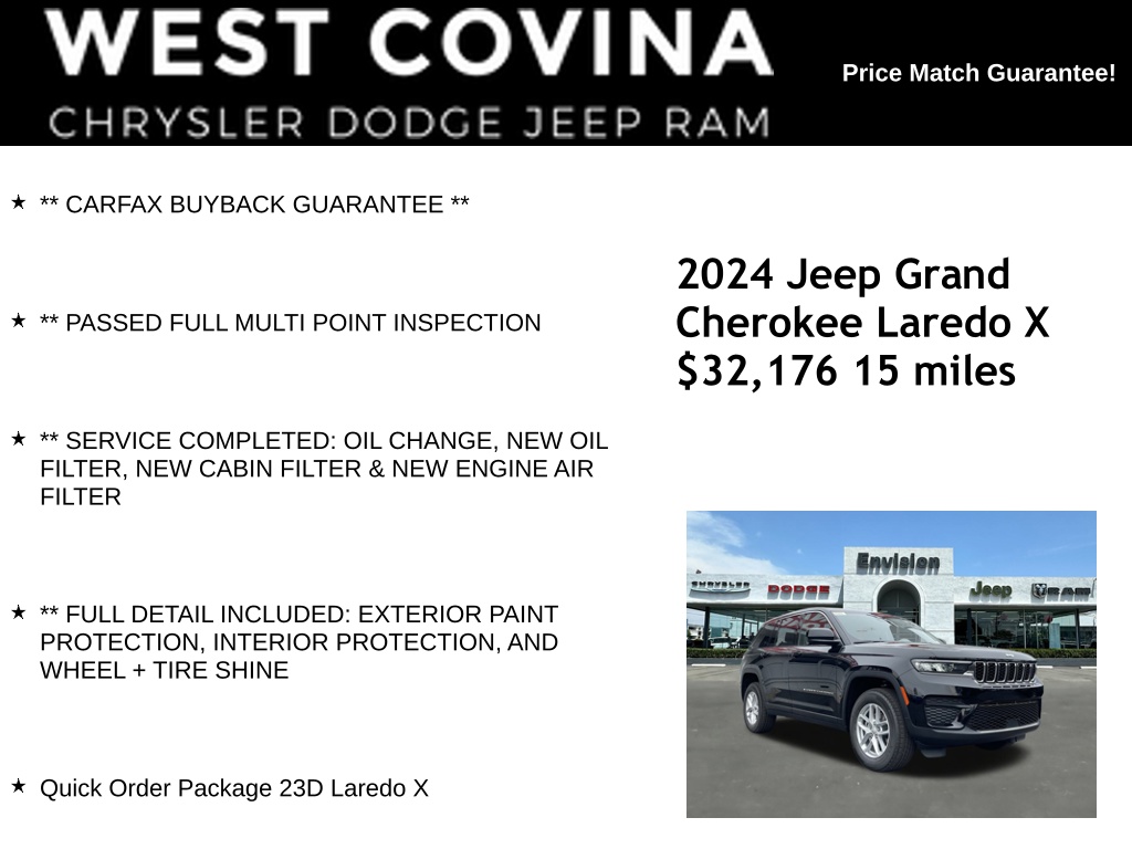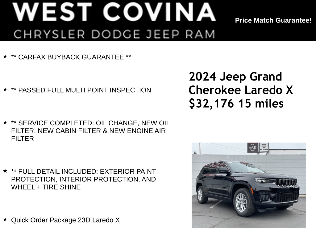 19/26 City/Highway MPG ** CARFAX BUYBACK GUARANTEE **, ** PASSED FULL MULTI POINT INSPECTION, ** SERVICE COMPLETED: OIL CHANGE, NEW OIL FILTER, NEW CABIN FILTER & NEW ENGINE AIR FILTER, ** FULL DETAIL INCLUDED: EXTERIOR PAINT PROTECTION, INTERIOR PROTECTION, AND WHEEL + TIRE SHINE, Laredo X, Power Sunroof, Quick Order Package 23D Laredo X, Wheels: 18" x 8" Fully Painted Aluminum.Diamond Black Crystal Pearlcoat2024 Jeep Grand Cherokee Laredo RWD 8-Speed Automatic 3.6L V6 24V VVT Price includes: $1000 - 2024 California BC Retail Consumer Cash. Exp. 07/01/2024 $500 - 2024 Retail Bonus Cash. Exp. 07/01/2024
