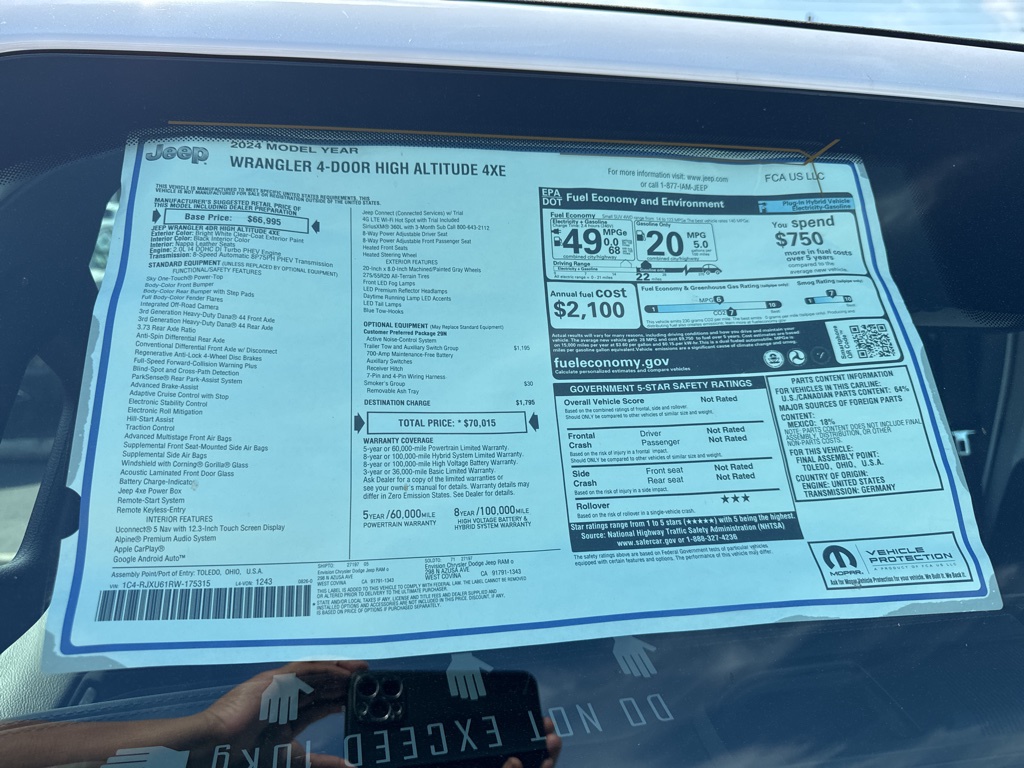 ** Additional Savings may be available to certain groups or individuals. Please contact us to see if you qualify. *Net Cost includes a Factory Rebate, if applicable, on this vehicle and is valid on a cash or financed purchase only by an individual for their personal use. The sale price or net cost does not apply to a lease. *All Pricing and Advertised Prices for any/all vehicles offered for sale does not include dealer installed accessories. *The Factory Rebates may not be available on this vehicle if you elect to take advantage of a Special Alternative APR or Special Lease program. Some Factory Rebates are California Resident specific and may vary for residents of other states. We Only Provide 4 Gallons of Gas at Purchase. *No sales to Dealers, Brokers or Exporters. No out of state purchase, customers must be present to purchase. Please contact us for special Multi-Vehicle or Fleet pricing. Prices are plus government fees and taxes, any finance charges, $85 documentary fee, $33 electronic registration fee, any emission testing charge and $1.75 per new tire state tire fee. All vehicles are subject to prior sale. *While every reasonable effort is made to ensure the accuracy of this information, we are not responsible for any errors or omissions contained on these pages. Leasing & financing available on approved credit. Trade-ins accepted. The estimated selling price that appears after calculating dealer offers is for informational purposes, only. You may not qualify for the offers, incentives, discounts, or financing. Offers, incentives, discounts, or financing are subject to expiration and other restrictions. See dealer for qualifications and complete details. *Images, prices, and options shown, including vehicle color, trim, options, pricing and other specifications are subject to availability, incentive offerings, current pricing and credit worthiness.2.0L I4 DOHC.Bright White Clearcoat2024 Jeep Wrangler Altitude 4WD 8-Speed Automatic 2.0L I4 DOHC**********All Pricing and Advertised Prices for any/all vehicles offered for sale does not include dealer installed accessories which can be purchased for an additional cost.********** The Factory Rebates may not be available on this vehicle if you elect to take advantage of a Special Alternative APR or Special Lease program. Some Factory Rebates are California Resident specific and may vary for residents of other states. NO sales to Dealers, Brokers or Exporters. For out of state purchase, customers must be present to purchase. If shipping is required, dealership must facilitate; no exceptions. Please contact us for special Multi-Vehicle or Fleet pricing. Prices are plus government fees and taxes, any finance charges, $85 documentary fee, $29 electronic registration fee, any emission testing charge and $1.75 per new tire state tire fee. *** We make every effort to provide accurate information, but please verify before purchasing. Leasing & financing available on approved credit. Trade-ins accepted. Subject to prior sale.
