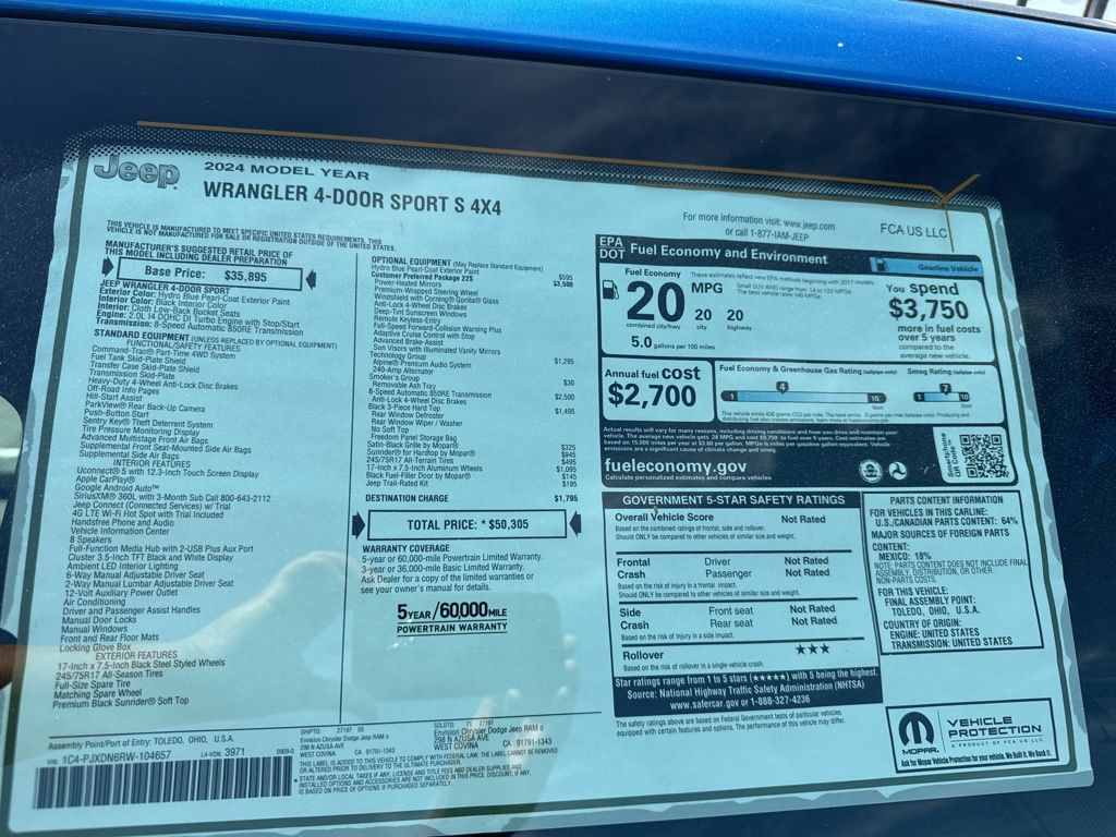 Hydro Blue Pearl Coat2024 Jeep Wrangler 4WD 8-Speed Automatic 2.0L I4 DOHC Price includes: $1000 - 2024 West BC Retail Bonus Cash. Exp. 01/02/2025 $3000 - 2024 Bonus Cash . Exp. 01/02/2025 $500 - 2024 National Holiday Bonus Cash. Exp. 01/02/2025