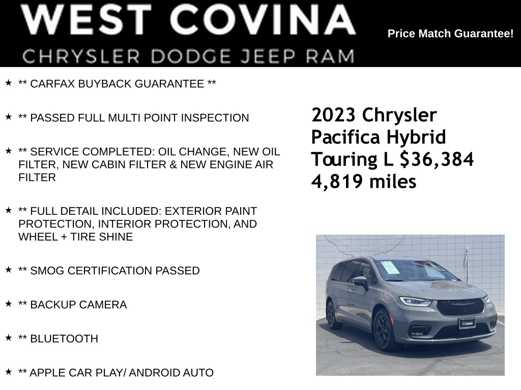 MEMORIAL DAY SALES EVENT HAS STARTED!!! COME CHECK OUT OUR HARD TO BEAT INVENTORY PRICES THAT HAVE BEEN REDUCED TO SAVE YOU MONEY. CALL (626) 899-9302 TO GET MORE INFORMATIONWE SPECIALIZE IN ALL CREDIT PROFILES! See what we can do for you! Call to find out (626) 899-9302.Recent Arrival! CARFAX One-Owner. Clean CARFAX.Odometer is 988 miles below market average! ** CARFAX BUYBACK GUARANTEE **, ** PASSED FULL MULTI POINT INSPECTION, ** SERVICE COMPLETED: OIL CHANGE, NEW OIL FILTER, NEW CABIN FILTER & NEW ENGINE AIR FILTER, ** FULL DETAIL INCLUDED: EXTERIOR PAINT PROTECTION, INTERIOR PROTECTION, AND WHEEL + TIRE SHINE, ** SMOG CERTIFICATION PASSED, ** BACKUP CAMERA, ** BLUETOOTH, ** APPLE CAR PLAY/ ANDROID AUTO, 3.6L V6, Anodized Ice Cave Accents, Anodized Ink Badging, Black Day Light Opening Moldings, Caprice Leatherette Bucket Seats w/S Logo, Front Fascia Air Deflectors, Piano Black Interior Accents, Premium Fascia Upper/Lower Grille w/Black Surround, Premium Rear Fascia Black, Quick Order Package 2EL, S Appearance Package, S Badge, Wheels: 18" x 7.5" S-Model Aluminum Design 3.Ceramic Gray Clearcoat2023 Chrysler Pacifica Hybrid Touring L FWD CVT 3.6L V6**********All Pricing and Advertised Prices for any/all vehicles offered for sale does not include dealer installed accessories which can be purchased for an additional cost.********** The Factory Rebates may not be available on this vehicle if you elect to take advantage of a Special Alternative APR or Special Lease program. Some Factory Rebates are California Resident specific and may vary for residents of other states. NO sales to Dealers, Brokers or Exporters. For out of state purchase, customers must be present to purchase. If shipping is required, dealership must facilitate; no exceptions. Please contact us for special Multi-Vehicle or Fleet pricing. Prices are plus government fees and taxes, any finance charges, $85 documentary fee, $29 electronic registration fee, any emission testing charge and $1.75 per new tire state tire fee. *** We make every effort to provide accurate information, but please verify before purchasing. Leasing & financing available on approved credit. Trade-ins accepted. Subject to prior sale.