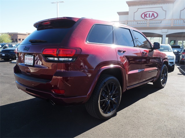 Priced below KBB Fair Purchase Price!Odometer is 3599 miles below market average!19/26 City/Highway MPGVelvet Red Pearlcoat 2019 Jeep Grand Cherokee Altitude RWD 8-Speed Automatic 3.6L V6 24V VVTIf you don't drive here, you can't save here!Price may not include recon fee. Altitude IV Package, Quick Order Package 2BZ Altitude (1-Year SiriusXM Radio Service, 1-Yr SiriusXM Guardian Trial, 4G LTE Wi-Fi Hot Spot, 5-Year SiriusXM Traffic Service, 5-Year SiriusXM Travel Link Service, 8.4" Touchscreen Display, Altitude Grille, Apple CarPlay, Auto-Dimming Rear-View Mirror, Black Suede Seats w/Black Stitching, Body Color Claddings, Body Color Fascia, Body Color Shark Fin Antenna, Dark Day Light Opening Moldings, Dark Headlamp Bezel Finish, Dark Lens Taillamps, Front Accent/Body Color Fascia, Gloss Black Rear Fascia Applique, Google Android Auto, GPS Antenna Input, GPS Navigation, HD Radio, Integrated Center Stack Radio, Integrated Voice Command w/Bluetooth, Jeep Black Gloss Badging, Power 4-Way Driver Lumbar Adjust, Power 8-Way Driver/Manual Passenger Seat, Radio: Uconnect 4C Nav w/8.4" Display, Rear Accent/Body Color Fascia, Rear Fascia Black MIC Step Pad, Single Exhaust w/Bright Tip, SiriusXM Satellite Radio, SiriusXM Traffic Plus, SiriusXM Travel Link, Steering Wheel Mounted Audio Controls, USB Host Flip, and Wheels: 20" x 8.0" Gloss Black Aluminum), Security & Convenience Group (115V Auxiliary Power Outlet, Heated Front Seats, Heated Steering Wheel, Power Liftgate, Security Alarm, and Universal Garage Door Opener), 3.27 Rear Axle Ratio, 4-Wheel Disc Brakes, 6 Speakers, ABS brakes, Air Conditioning, Alloy wheels, AM/FM radio, Anti-whiplash front head restraints, Apple CarPlay/Android Auto, Automatic temperature control, Brake assist, Bumpers: body-color, Cargo Compartment Cover, Cloth Bucket Seats, Compass, Delay-off headlights, Driver door bin, Driver vanity mirror, Dual front impact airbags, Dual front side impact airbags, Eco Suspension I, Electronic Stability Control, Four wheel independent suspension, Front anti-roll bar, Front Bucket Seats, Front Center Armrest w/Storage, Front dual zone A/C, Front fog lights, Front License Plate Bracket, Front reading lights, Fully automatic headlights, Heated door mirrors, Illuminated entry, Knee airbag, Leather Shift Knob, Low tire pressure warning, Manufacturer's Statement of Origin, Occupant sensing airbag, Outside temperature display, Overhead airbag, Overhead console, Panic alarm, ParkView Rear Back-Up Camera, Passenger door bin, Passenger vanity mirror, Power door mirrors, Power steering, Power Sunroof, Power windows, Radio data system, Radio: Uconnect 4 w/7" Display, Rear anti-roll bar, Rear reading lights, Rear seat center armrest, Rear window defroster, Rear window wiper, Remote keyless entry, Speed control, Speed-sensing steering, Speed-Sensitive Wipers, Split folding rear seat, Spoiler, Steering wheel mounted audio controls, Tachometer, Telescoping steering wheel, Tilt steering wheel, Traction control, Trip computer, Variably intermittent wipers, and Wheels: 17" x 8.0" Silver Aluminum.