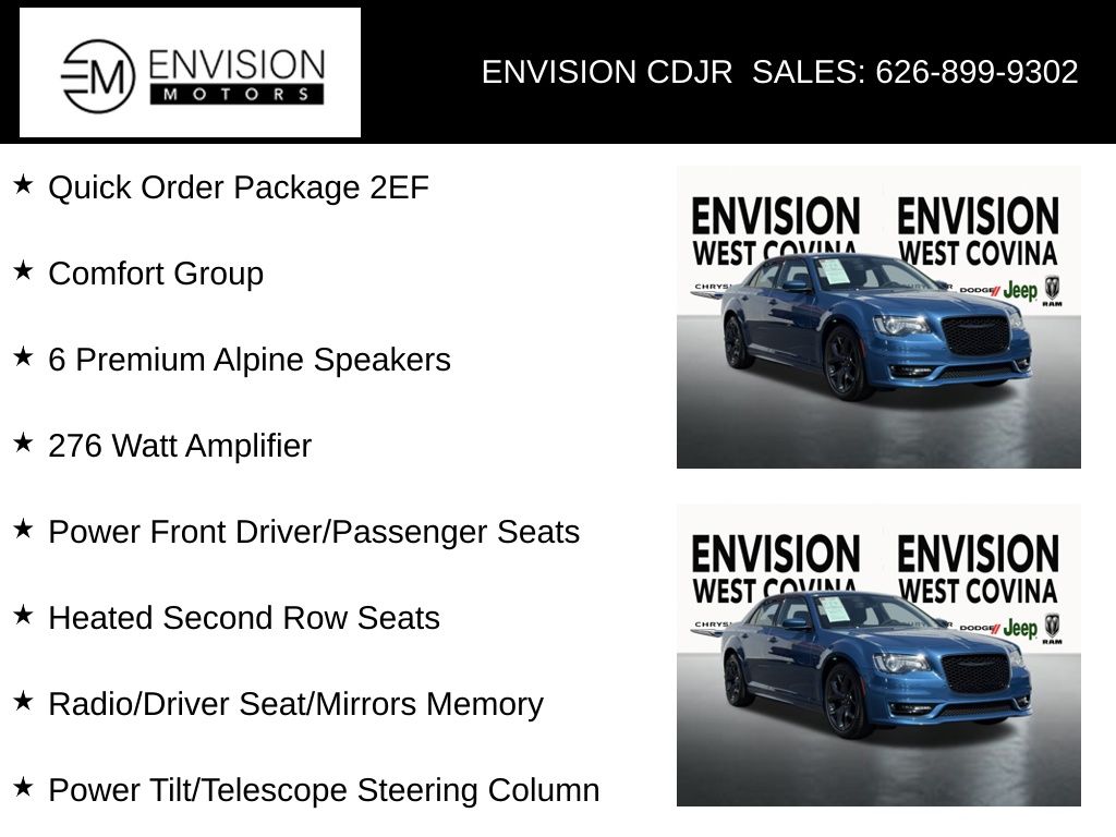 WE SPECIALIZE IN ALL CREDIT PROFILES! See what we can do for you! Call to find out (626) 899-9302.Certified. CARFAX One-Owner. Clean CARFAX.Odometer is 20534 miles below market average! 19/30 City/Highway MPG 276 Watt Amplifier, 6 Premium Alpine Speakers, Adaptive Bi-Xenon HID Headlamps, Auto-Dimming Rear-View Mirror, Automatic Headlamp Leveling System, Blind Spot & Cross Path Detection, Body Color Exterior Mirrors, Comfort Group, Delete Power Backlight Sunshade, Deluxe Security Alarm, Door Sill Scuff Pads, Driver & Passenger Lower LED Lamps, Exterior Mirrors Courtesy Lamps, Exterior Mirrors w/Heating Element, Exterior Mirrors w/Supplemental Signals, Front & Rear LED Map Pocket Lights, Heated Front Seats, Heated Second Row Seats, Heated Steering Wheel, Leather w/Perforated Insert Bucket Seats, Power 2-Way Driver Lumbar Adjust, Power 2-Way Passenger Lumbar Adjust, Power Front Driver/Passenger Seats, Power Multi Function Mirror Manual Fold, Power Tilt/Telescope Steering Column, Quick Order Package 2EF, Radio/Driver Seat/Mirrors Memory, Rear Armrest w/Cupholder Seat, Ventilated Front Seats.Frostbite2023 Chrysler 300 Touring RWD 8-Speed Automatic 3.6L V6 24V VVTFCA US LLC Certified Pre-Owned Details: * Powertrain Limited Warranty: 84 Month/100,000 Mile (whichever comes first) from original in-service date * Vehicle History * Warranty Deductible: $100 * Roadside Assistance * Transferable Warranty * Vehicles Up to 75,000 Miles and/or 5 Model Years. 24-Hour Towing & Roadside Assistance, Car Rental Allowance, CARFAX® Vehicle History ReportTM and an Introductory 3-month Subscription to SiriusXM® Satellite Radio & Certified Warranty Upgrades * 125 Point Inspection * Limited Warranty: 3 Month/3,000 Mile (whichever comes first) after new car warranty expires or from certified purchase date**********All Pricing and Advertised Prices for any/all vehicles offered for sale does not include dealer installed accessories which can be purchased for an additional cost.********** The Factory Rebates may not be available on this vehicle if you elect to take advantage of a Special Alternative APR or Special Lease program. Some Factory Rebates are California Resident specific and may vary for residents of other states. NO sales to Dealers, Brokers or Exporters. For out of state purchase, customers must be present to purchase. If shipping is required, dealership must facilitate; no exceptions. Please contact us for special Multi-Vehicle or Fleet pricing. Prices are plus government fees and taxes, any finance charges, $85 documentary fee, $29 electronic registration fee, any emission testing charge and $1.75 per new tire state tire fee. *** We make every effort to provide accurate information, but please verify before purchasing. Leasing & financing available on approved credit. Trade-ins accepted. Subject to prior sale.
