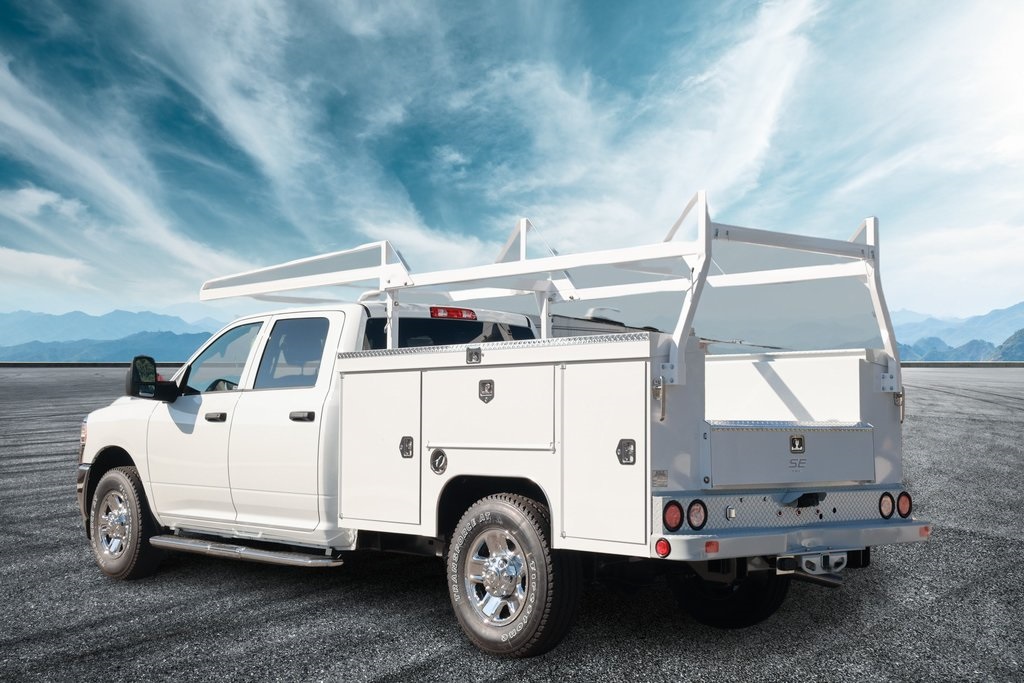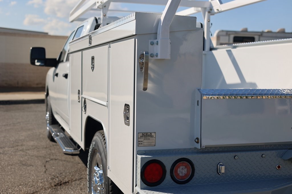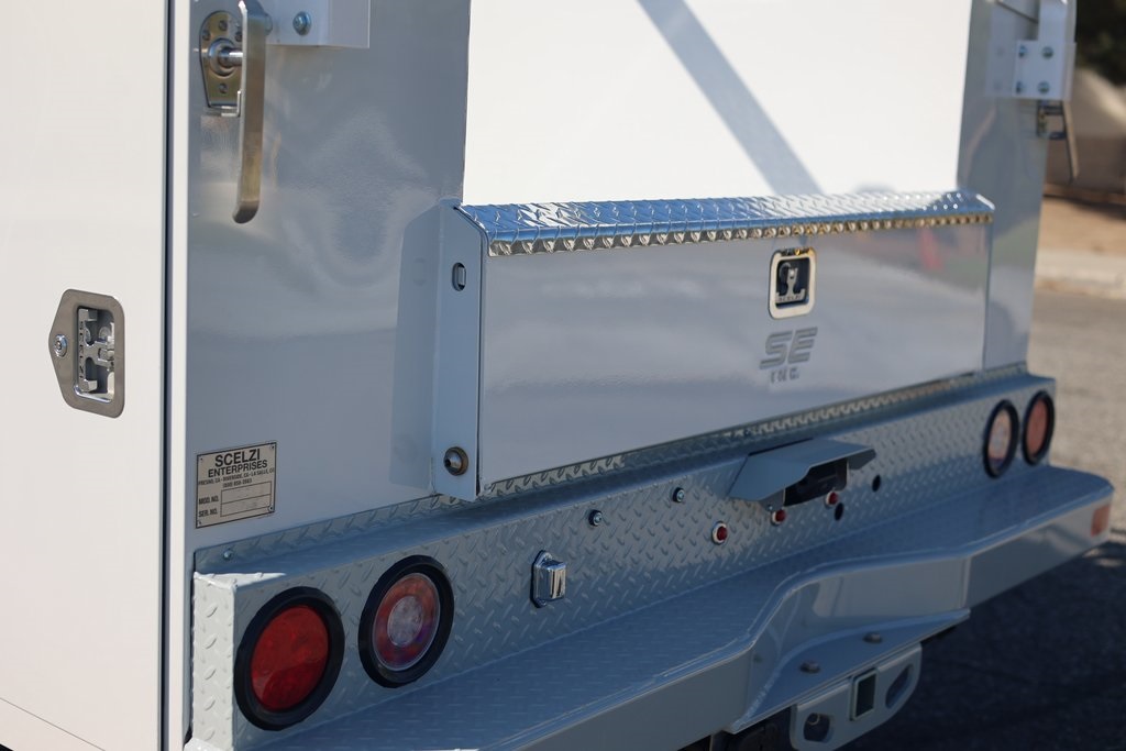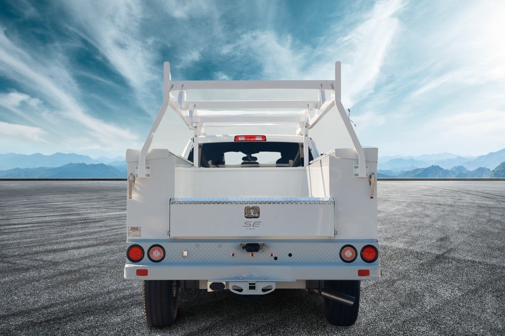 8ft Scelzi Service Body - Treadbright Pop Top Lids, Tapered Leg Ladder Rack w/ Hooks and Forklift Ready Swing Away Cross bars, 6" Diamond Plate Step Bumper, 2.5" Class V Tube Receiver w/ 2" Sleeve, Backup Camera