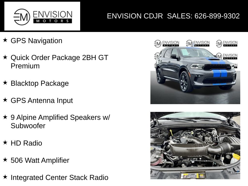 WE SPECIALIZE IN ALL CREDIT PROFILES! See what we can do for you! Call to find out (626) 899-9302.Certified. CARFAX One-Owner. Clean CARFAX.Odometer is 40539 miles below market average! AWD, 1-Year Trial (Registration Required), 10.1" Touchscreen Display, 115V Auxiliary Power Outlet, 180 Amp Alternator, 4G LTE Wi-Fi Hot Spot, 506 Watt Amplifier, 7 & 4 Pin Wiring Harness, 9 Alpine Amplified Speakers w/Subwoofer, Adaptive Cruise Control w/Stop, Advanced Brake Assist, Apple CarPlay, Auto High Beam Headlamp Control, Auto-Dimming Exterior Driver Mirror, Black Roof Rails, Blacktop Package, Bright Cargo Area Scuff Pads, Bright Front Door Sill Scuff Pads, Class IV Receiver Hitch, Connected Travel & Traffic Services, Disassociated Touchscreen Display, Dual Remote USB Port - Charge Only, Exterior Mirrors w/Heating Element, Exterior Mirrors w/Memory, Exterior Mirrors w/Supplemental Signals, Floor Console w/Leather Armrest, Full Speed Forward Collision Warning Plus, Gloss Black Badges, Gloss Black Exterior Mirrors, Google Android Auto, GPS Antenna Input, GPS Navigation, GT Gloss Black Badging, HD Radio, Heated Second Row Seats, Heavy-Duty Engine Cooling, Integrated Center Stack Radio, Integrated Roof Rail Crossbars, Integrated Voice Command w/Bluetooth, Lane Departure Warning Plus, Leather Trimmed Bucket Seats, Leather Wrapped Door Panels, LED Auxiliary Low Beam & Turn Signal, ParkSense Front/Rear Park Assist w/Stop, Power 6x9 Multi-Function Foldaway Mirrors, Power 8-Way Driver Memory 8-Way Passenger Seats, Power Driver/Passenger 4-Way Lumbar Adjust, Power Sunroof, Power Tilt & Telescopic Steering Column, Premium Door Trim Panel, Premium Instrument Panel, Premium LED Fog Lamps, Quick Order Package 2BH GT Premium, Radio: Uconnect 5 Nav w/10.1" Display, Radio/Driver Seat/Mirrors Memory, Rain Sensitive Windshield Wipers, Rear Load Leveling Suspension, Red Accent Stitching, Satin Black Dodge Tail Lamp Badge, Security Alarm, SiriusXM Guardian - Included Trial (B), SiriusXM w/360L, Sun Visors w/Illuminated Vanity Mirrors, Trailer Brake Control, USB Host Flip, Ventilated Front Seats, Wheels: 20" x 8.0" Black Noise Aluminum, Wireless Charging Pad.Vapor Gray2023 Dodge Durango GT AWD 8-Speed Automatic 3.6L V6 24V VVTFCA US LLC Certified Pre-Owned Details: * Vehicle History * Transferable Warranty * Powertrain Limited Warranty: 84 Month/100,000 Mile (whichever comes first) from original in-service date * 125 Point Inspection * Warranty Deductible: $100 * Vehicles Up to 75,000 Miles and/or 5 Model Years. 24-Hour Towing & Roadside Assistance, Car Rental Allowance, CARFAX® Vehicle History ReportTM and an Introductory 3-month Subscription to SiriusXM® Satellite Radio & Certified Warranty Upgrades * Limited Warranty: 3 Month/3,000 Mile (whichever comes first) after new car warranty expires or from certified purchase date * Roadside Assistance**********All Pricing and Advertised Prices for any/all vehicles offered for sale does not include dealer installed accessories which can be purchased for an additional cost.********** The Factory Rebates may not be available on this vehicle if you elect to take advantage of a Special Alternative APR or Special Lease program. Some Factory Rebates are California Resident specific and may vary for residents of other states. NO sales to Dealers, Brokers or Exporters. For out of state purchase, customers must be present to purchase. If shipping is required, dealership must facilitate; no exceptions. Please contact us for special Multi-Vehicle or Fleet pricing. Prices are plus government fees and taxes, any finance charges, $85 documentary fee, $29 electronic registration fee, any emission testing charge and $1.75 per new tire state tire fee. *** We make every effort to provide accurate information, but please verify before purchasing. Leasing & financing available on approved credit. Trade-ins accepted. Subject to prior sale.