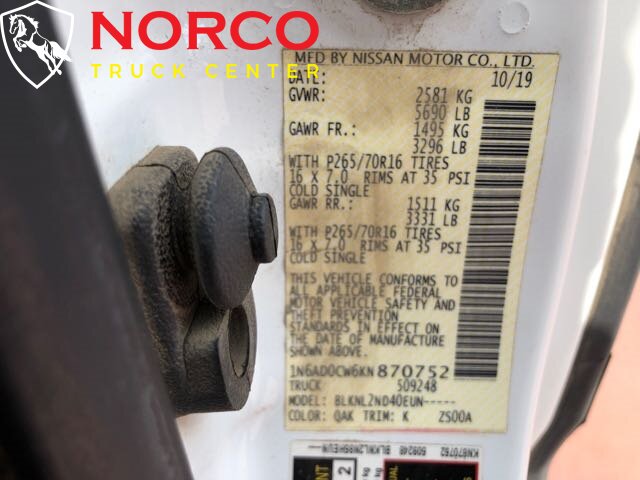 The 2019 Nissan Frontier SV V6 Extended Cab Short Bed is a reliable and capable midsize pickup truck, perfect for both work and play. It is powered by a robust 4.0L V6 engine that delivers 261 horsepower and 281 lb-ft of torque, providing plenty of power to handle any task. As a factory default, this model comes equipped with several standard features that enhance comfort and convenience. It includes air conditioning, power windows and door locks, remote keyless entry, and a 7-inch touchscreen display with NissanConnect infotainment system, Bluetooth connectivity, and a six-speaker audio system. Safety features include anti-lock brakes, stability control, traction control, and a rearview camera. The vehicle also features front, side, and curtain airbags, as well as a tire pressure monitoring system. Other notable features include a spray-on bedliner, cargo tie-downs, and a sliding rear window. The 2019 Nissan Frontier SV V6 Extended Cab Short Bed is an excellent option for those seeking a reliable and practical pickup truck with impressive performance capabilities and an array of standard features. -- INSTALLED FEATURES: Front air conditioning, Front air conditioning zones: single, Airbag deactivation: occupant sensing passenger, Front airbags: dual, Side airbags: front, Side curtain airbags: front / rear, Antenna type: mast, Auxiliary audio input: Bluetooth / USB / iPod/iPhone / jack, Radio: AM/FM / touch screen display / voice operated, Radio data system, Speed sensitive volume control, Total speakers: 4, ABS: 4-wheel, Electronic brakeforce distribution, Front brake diameter: 11.7, Front brake type: ventilated disc, Front brake width: 1.1, Power brakes, Rear brake diameter: 11.3, Rear brake type: ventilated disc, Rear brake width: 0.71, Floor material: carpet, Interior accents: metallic-tone, Shift knob trim: urethane, Steering wheel trim: urethane, Assist handle: front, Center console: front console with armrest and storage, Cruise control, Cupholders: front / rear, Multi-function remote: keyless entry / panic alarm, One-touch windows: 1, Overhead console: front, Power outlet(s): three 12V front, Power steering: variable/speed-proportional, Power windows: lockout button, Reading lights: front, Rearview mirror: manual day/night, Steering wheel: tilt, Steering wheel mounted controls: audio / cruise control / phone / voice control, Storage: door pockets / sunglasses holder / under rear seats, Vanity mirrors: dual, 4WD selector: electronic hi-lo, 4WD type: part time, Axle ratio: 3.54, Locking differential: rear, Alternator: 130 amps, Battery saver, Door handle color: black, Front bumper color: body-color, Grille color: black / chrome surround, Mirror color: black, Mudguards: front / rear, Pickup bed light, Rear bumper color: chrome, Rear spoiler: tail-gate, Rear spoiler color: black, Side door type: dual rear-hinged access, Tailgate: removable, Window trim: black, Infotainment screen size: 7 in., Clock, Digital odometer, Gauge: oil pressure / tachometer, Trip odometer, Warnings and reminders: low fuel level, Headlights: auto delay off / halogen, Side mirror adjustments: manual folding / power, Active head restraints: dual front, Camera system: rearview, Child seat anchors: LATCH system, Crumple zones: front, Rearview monitor: in dash, Emergency locking retractors: front / rear, Front seatbelts: 3-point, Rear seatbelts: 3-point, Seatbelt force limiters: front, Seatbelt pretensioners: front, Seatbelt warning sensor: front, Driver seat manual adjustments: reclining / 4, Front headrests: adjustable / 2, Front seat type: bucket, Passenger seat manual adjustments: reclining / 4, Rear headrests: adjustable / 2, Rear seat folding: folds up, Rear seat type: jumpseats, Upholstery: cloth, Anti-theft system: vehicle immobilizer, Power door locks: anti-lockout / auto-locking, Hill holder control, Off-road driving assist: hill descent, Stability control, Traction control, Steering ratio: 20.4, Turns lock-to-lock: 3.6, Front shock type: gas, Front spring type: coil, Front stabilizer bar: diameter 34 mm, Front struts, Front suspension classification: independent, Front suspension type: double wishbone, Rear shock type: gas, Rear spring type: leaf, Rear suspension classification: solid live axle, Rear suspension type: multi-leaf, Electronic messaging assistance: voice operated / with read function, Phone: hands free, Satellite communications: voice guided directions, Wireless data link: Bluetooth, Spare tire mount location: underbody, Spare tire size: full-size, Spare wheel type: steel, Tire Pressure Monitoring System, Tire type: all season, Wheels: aluminum alloy, Pickup bed cargo management: tie-down anchors, Tow hooks: front, Front wipers: variable intermittent, Pickup sliding rear window: manual, Power windows: remotely operated, Rear privacy glass