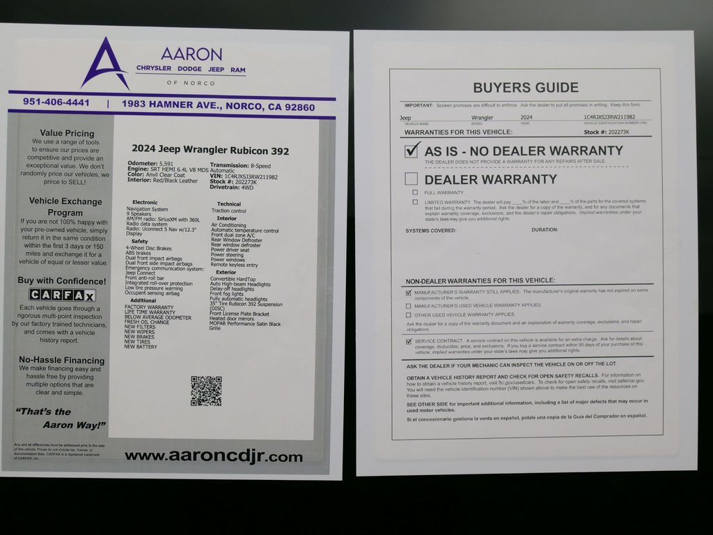 Priced below KBB Fair Purchase Price!FACTORY WARRANTY, BELOW AVERAGE ODOMETER, FRESH OIL CHANGE, NEW FILTERS, NEW WIPERS, Wrangler Rubicon 392, 4D Sport Utility, SRT HEMI 6.4L V8 MDS, 8-Speed Automatic, 4WD, 35" Tire Rubicon 392 Suspension (DISC), Alloy wheels, Apple CarPlay/Android Auto, Compass, Convertible HardTop, Dual front impact airbags, Front dual zone A/C, Front fog lights, Low tire pressure warning, Navigation System, Overhead airbag, ParkView Rear Back-Up Camera, Quick Order Package 27X Rubicon 392 (DISC), Radio: Uconnect 5 Nav w/12.3" Display.Clean CARFAX.CARFAX One-Owner.
