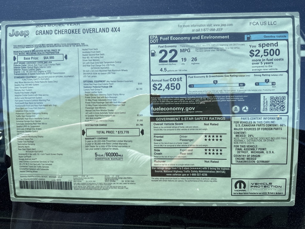 19/26 City/Highway MPG ** PASSED FULL MULTI POINT INSPECTION, ** SERVICE COMPLETED: OIL CHANGE, NEW OIL FILTER, NEW CABIN FILTER & NEW ENGINE AIR FILTER, ** FULL DETAIL INCLUDED: EXTERIOR PAINT PROTECTION, INTERIOR PROTECTION, AND WHEEL + TIRE SHINE, ** SMOG CERTIFICATION PASSED, ** BACKUP CAMERA, ** BLUETOOTH, ** APPLE CAR PLAY/ ANDROID AUTO, 4WD.Velvet Red Pearlcoat2024 Jeep Grand Cherokee Overland 4WD 8-Speed Automatic 3.6L V6 24V VVT Price includes: $1000 - 2024 JEEP California BC Retail Consumer Cash 71CR1. Exp. 06/03/2024 $2000 - 2024 JEEP Retail Bonus Cash 24CRA1. Exp. 01/02/2025