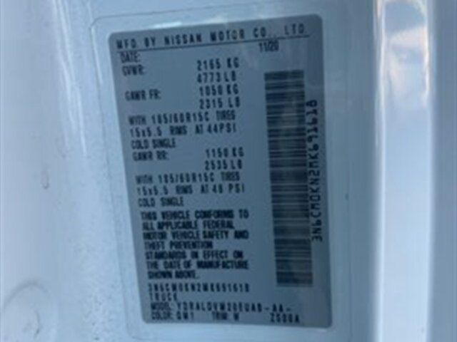 -- INSTALLED FEATURES: Air filtration, Front air conditioning, Front air conditioning zones: single, Airbag deactivation: occupant sensing passenger, Front airbags: dual, Side airbags: front, Side curtain airbags: front, Antenna type: diversity / mast, Auxiliary audio input: Bluetooth / USB / iPod/iPhone / jack, In-Dash CD: single disc, Radio: AM/FM / touch screen display / voice operated, Radio data system, Satellite radio: SiriusXM, Total speakers: 2, ABS: 4-wheel, Braking assist, Electronic brakeforce distribution, Front brake diameter: 11.1, Front brake type: ventilated disc, Front brake width: 1.1, Power brakes, Rear brake diameter: 9.0, Rear brake type: drum, Floor material: cargo area rubber/vinyl / rubber/vinyl, Shift knob trim: urethane, Steering wheel trim: urethane, Cargo area light, Center console: front console with storage, Cruise control, Cupholders: front / 2, One-touch windows: 2, Power outlet(s): 12V front / USB front, Power steering, Power windows: lockout button, Reading lights: front, Steering wheel mounted controls: audio / cruise control / phone / voice control, Storage: door pockets / in dash / under front seats, Sun visors, Tray tables, Axle ratio: 5.41, Alternator: 150 amps, Battery: heavy duty / maintenance-free, Battery saver, Emissions: 50 state, Heavy duty alternator, Door handle color: black, Front bumper color: body-color, Grille color: black, Mirror color: black, Rear bumper color: black, Rear trunk/liftgate: barn, Side door type: dual manual sliding, Window trim: black, Infotainment: NissanConnect, Infotainment screen size: 7 in., Smartphone integration: Android Auto / Apple CarPlay, Clock, Digital odometer, External temperature display, Fuel economy display: MPG / range, Gauge: tachometer, Trip odometer, Warnings and reminders: coolant temperature warning / lamp failure / low battery / low fuel level / low oil pressure / low washer fluid, Daytime running lights, Headlights: auto delay off / halogen, Side mirror adjustments: manual / manual folding, OEM roof height: undefined, Active head restraints: dual front, Camera system: rearview, Crumple zones: front / rear, Rearview monitor: in dash, Safety brake pedal system, Emergency locking retractors: front, Front seatbelts: 3-point, Seatbelt force limiters: front, Seatbelt pretensioners: front, Seatbelt warning sensor: front, Driver seat manual adjustments: height / reclining / 6, Front headrests: adjustable / 2, Front seat type: bucket, Passenger seat folding: folds flat, Passenger seat manual adjustments: reclining / 4, Upholstery: cloth, Anti-theft system: alarm / vehicle immobilizer, Power door locks: anti-lockout / auto-locking, Hill holder control, Stability control, Traction control, Steering ratio: 18.3, Turns lock-to-lock: 3.3, Front shock type: twin-tube gas, Front spring type: coil, Front stabilizer bar, Front struts: MacPherson, Front suspension classification: independent, Front suspension type: lower control arms, Rear shock type: twin-tube gas, Rear spring type: leaf, Rear suspension classification: solid axle, Rear suspension type: multi-leaf, Electronic messaging assistance: with read function, Phone: hands free, Wireless data link: Bluetooth, Spare tire mount location: underbody, Spare tire size: full-size matching, Spare wheel type: steel, Tire Pressure Monitoring System, Tire type: all season, Wheels: steel, Front wipers: variable intermittent, Power windows: safety reverse