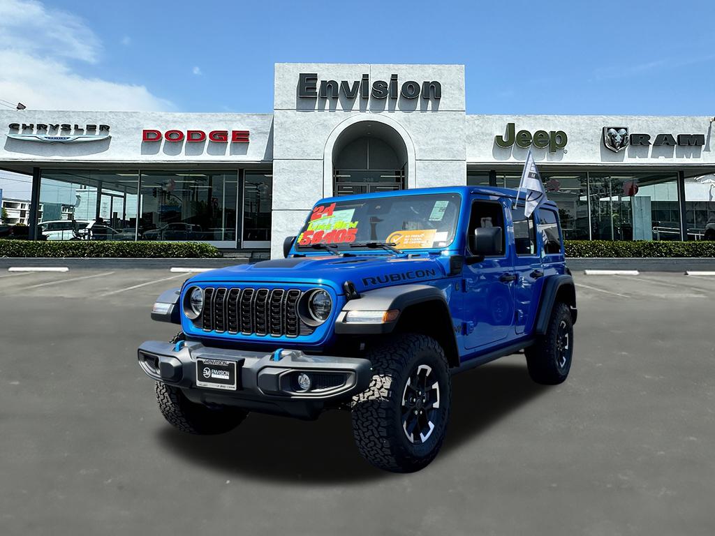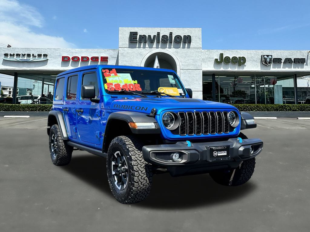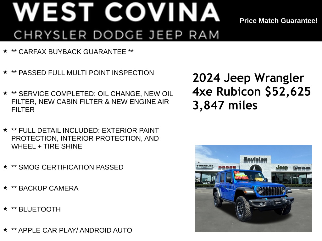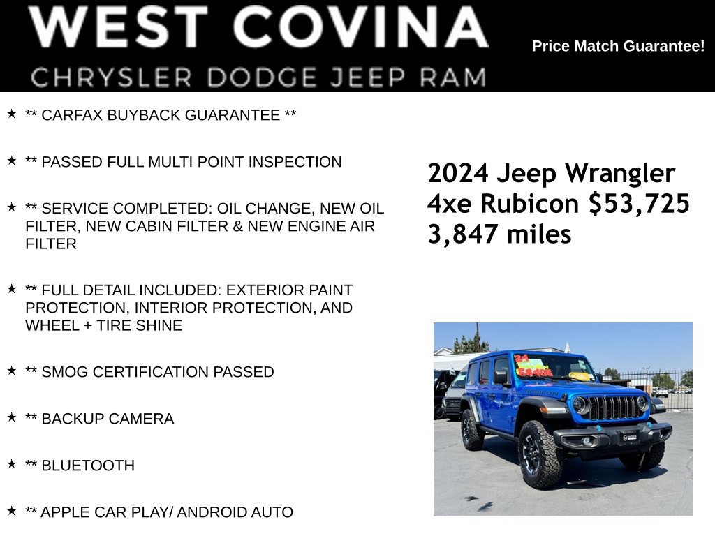 INDEPENDENCE DAY CELEBRATION HAS BEGUN. COME CHECK OUT OUR HARD TO BEAT INVENTORY PRICES. CALL (626) 899-9302 TO GET MORE INFORMATIONWE SPECIALIZE IN ALL CREDIT PROFILES! See what we can do for you! Call to find out (626) 899-9302.Recent Arrival! CARFAX One-Owner. Clean CARFAX.** CARFAX BUYBACK GUARANTEE **, ** PASSED FULL MULTI POINT INSPECTION, ** SERVICE COMPLETED: OIL CHANGE, NEW OIL FILTER, NEW CABIN FILTER & NEW ENGINE AIR FILTER, ** FULL DETAIL INCLUDED: EXTERIOR PAINT PROTECTION, INTERIOR PROTECTION, AND WHEEL + TIRE SHINE, ** SMOG CERTIFICATION PASSED, ** BACKUP CAMERA, ** BLUETOOTH, ** APPLE CAR PLAY/ ANDROID AUTO, 2.0L I4 DOHC, Cigar Lighter, Convenience Group, Heated Front Seats, Heated Steering Wheel, Quick Order Package 29V Rubicon, Remote Start System, Removable Ash Tray, Smoker's Group, Universal Garage Door Opener.Hydro Blue Pearlcoat2024 Jeep Wrangler Rubicon 4xe 4WD 8-Speed Automatic 2.0L I4 DOHC**********All Pricing and Advertised Prices for any/all vehicles offered for sale does not include dealer installed accessories which can be purchased for an additional cost.********** The Factory Rebates may not be available on this vehicle if you elect to take advantage of a Special Alternative APR or Special Lease program. Some Factory Rebates are California Resident specific and may vary for residents of other states. NO sales to Dealers, Brokers or Exporters. For out of state purchase, customers must be present to purchase. If shipping is required, dealership must facilitate; no exceptions. Please contact us for special Multi-Vehicle or Fleet pricing. Prices are plus government fees and taxes, any finance charges, $85 documentary fee, $29 electronic registration fee, any emission testing charge and $1.75 per new tire state tire fee. *** We make every effort to provide accurate information, but please verify before purchasing. Leasing & financing available on approved credit. Trade-ins accepted. Subject to prior sale.